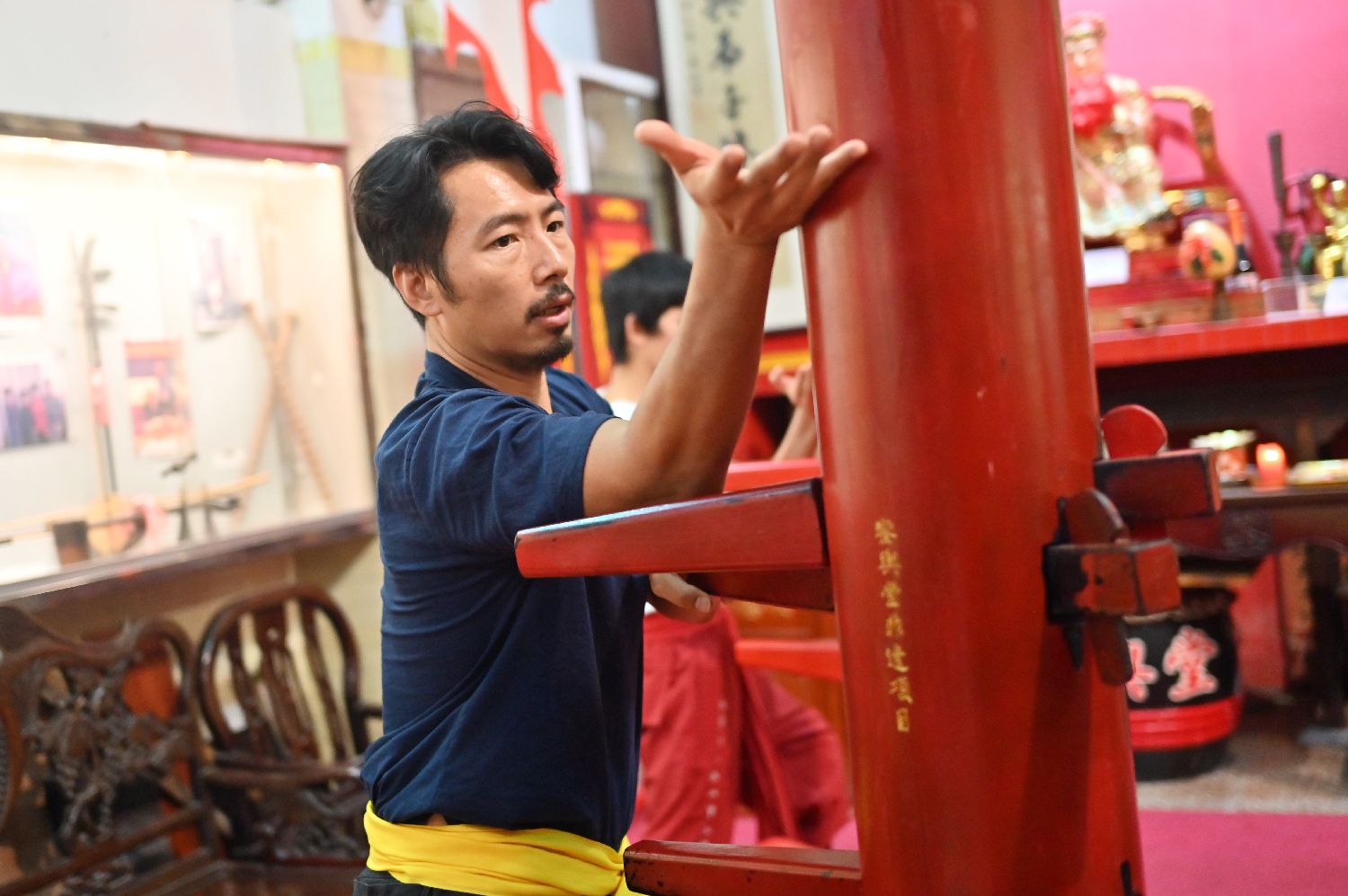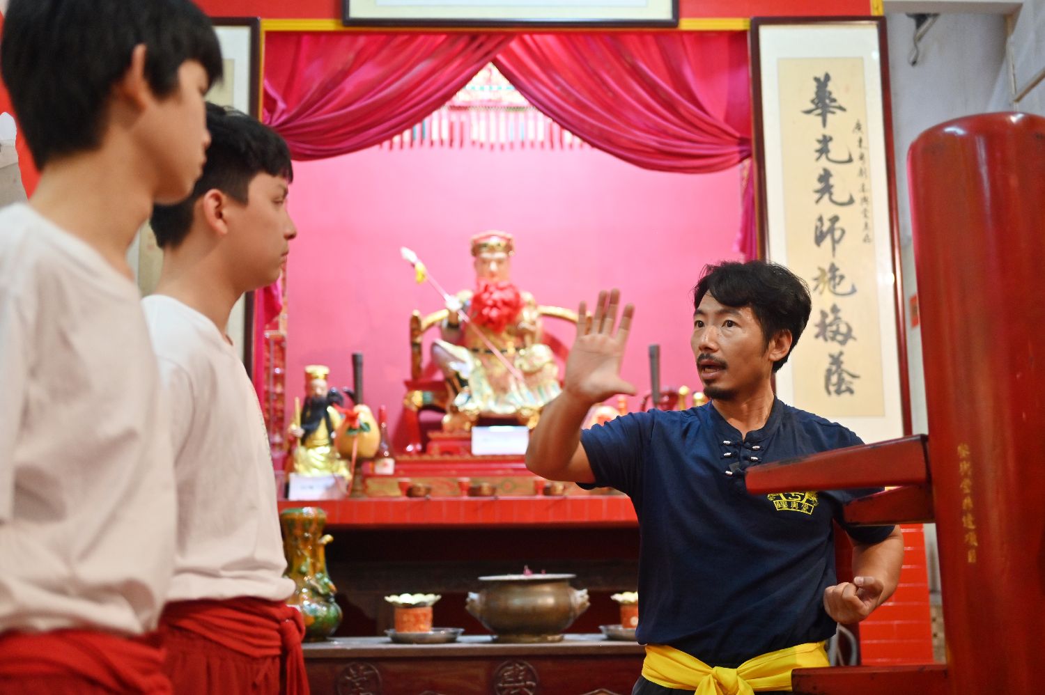 11月24日,广州市荔湾区,李健豪在銮舆堂指导他的徒弟练习红船木人桩。中新社
