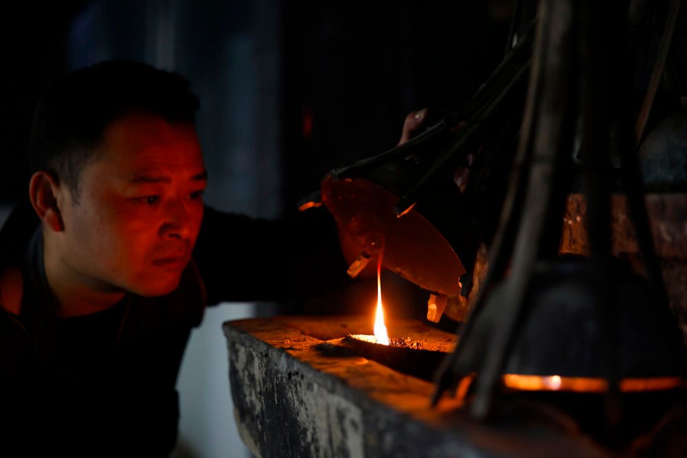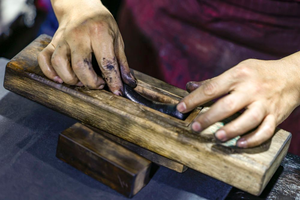 12月3日,在安徽省黄山市屯溪胡开文墨厂,制墨手艺人给墨胚加温。