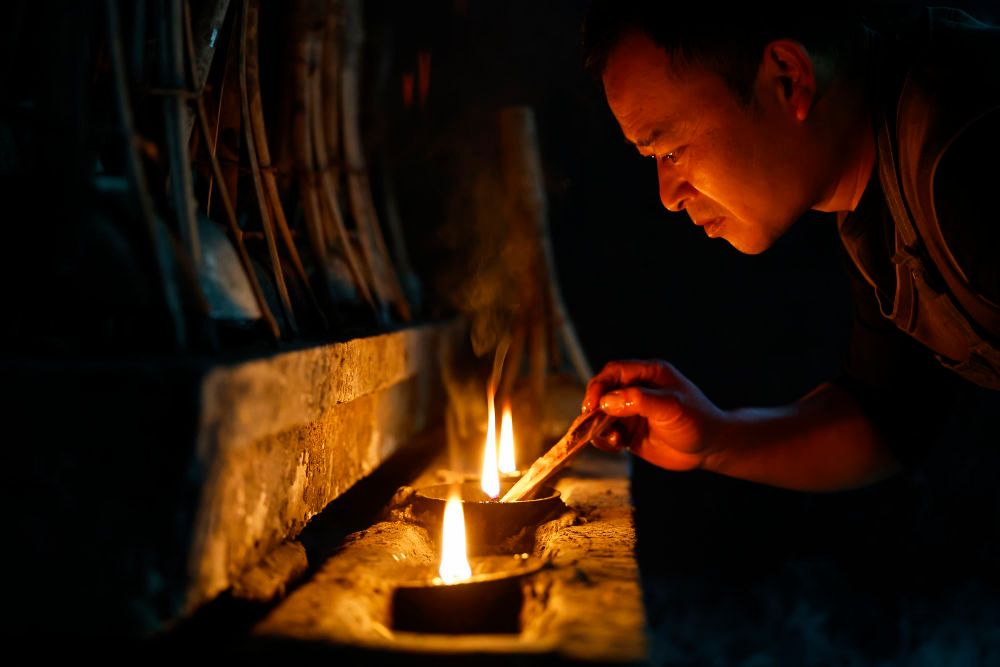 12月3日,在安徽省黄山市屯溪胡开文墨厂,徽墨制作技艺非遗传承人吴靖用古法点烟的方式收取烟炱制墨。