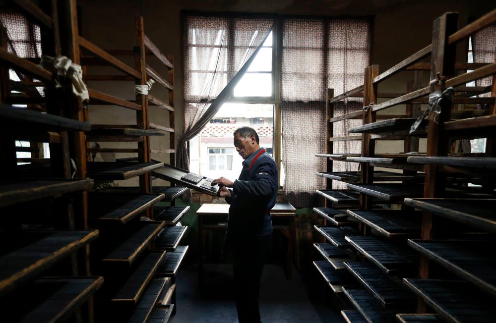 12月3日,在安徽省黄山市屯溪胡开文墨厂,制墨手艺人在晾墨。