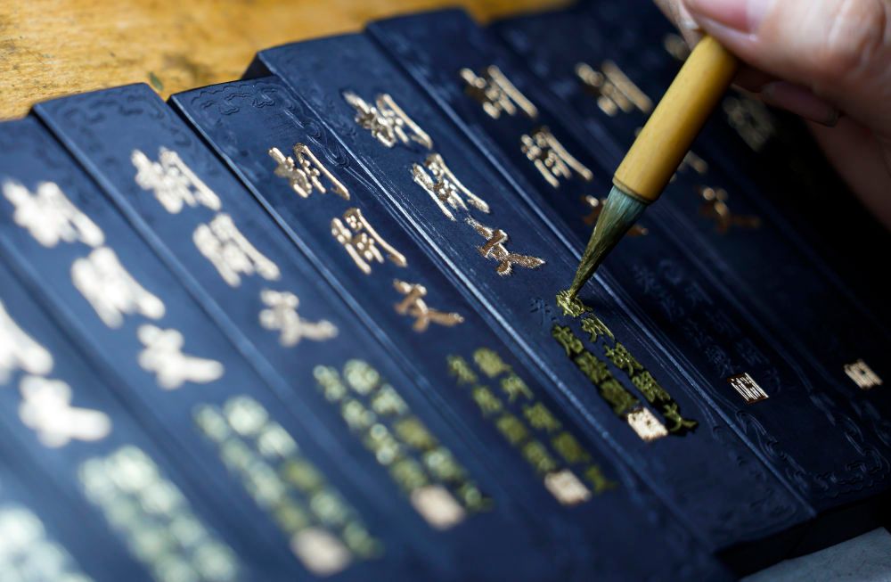 12月3日,在安徽省黄山市屯溪胡开文墨厂,制墨手艺人在墨上描金。