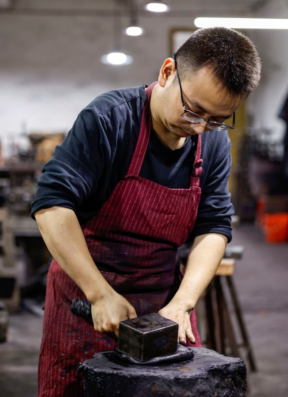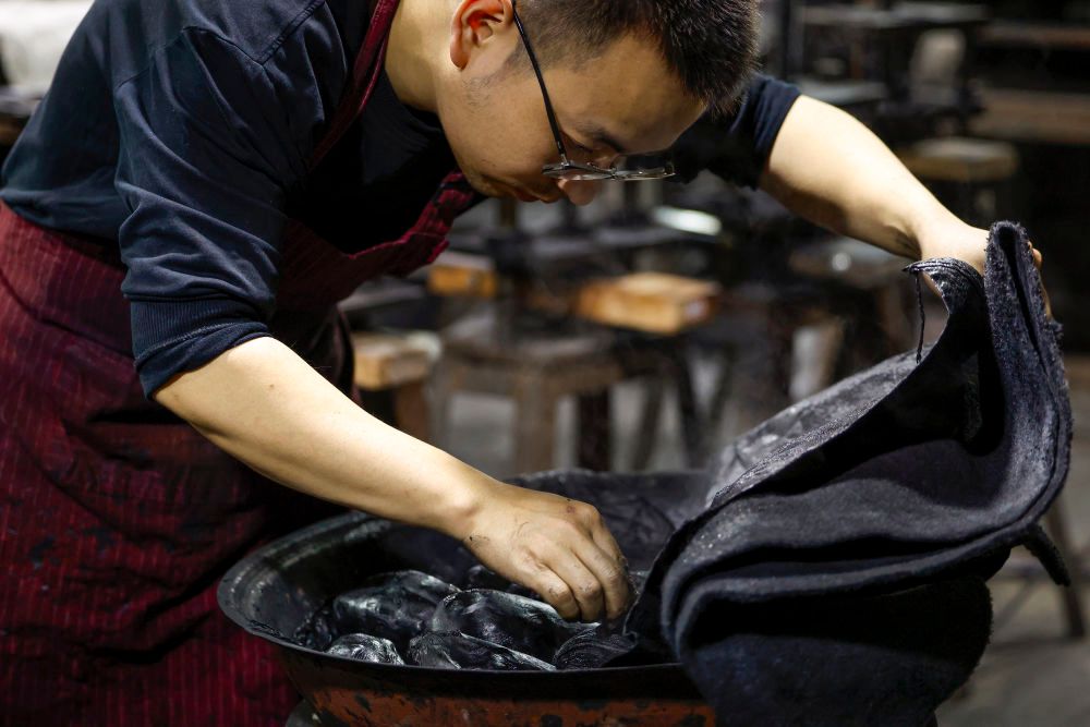 12月3日,在安徽省黄山市屯溪胡开文墨厂,制墨手艺人在锤打墨团。