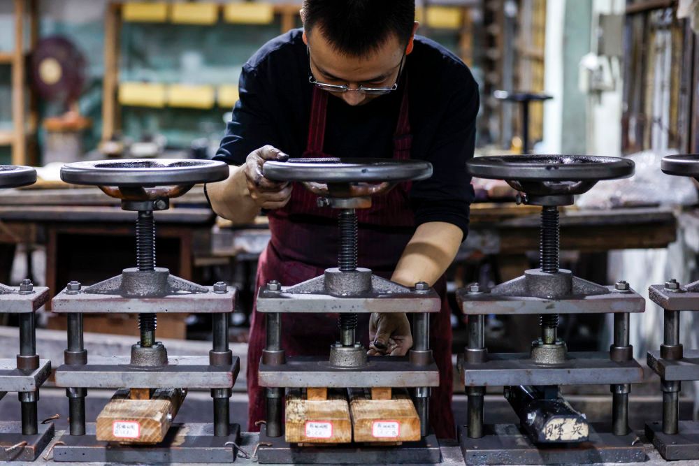 12月3日,在安徽省黄山市屯溪胡开文墨厂,制墨手艺人将墨团放入墨模中压制。