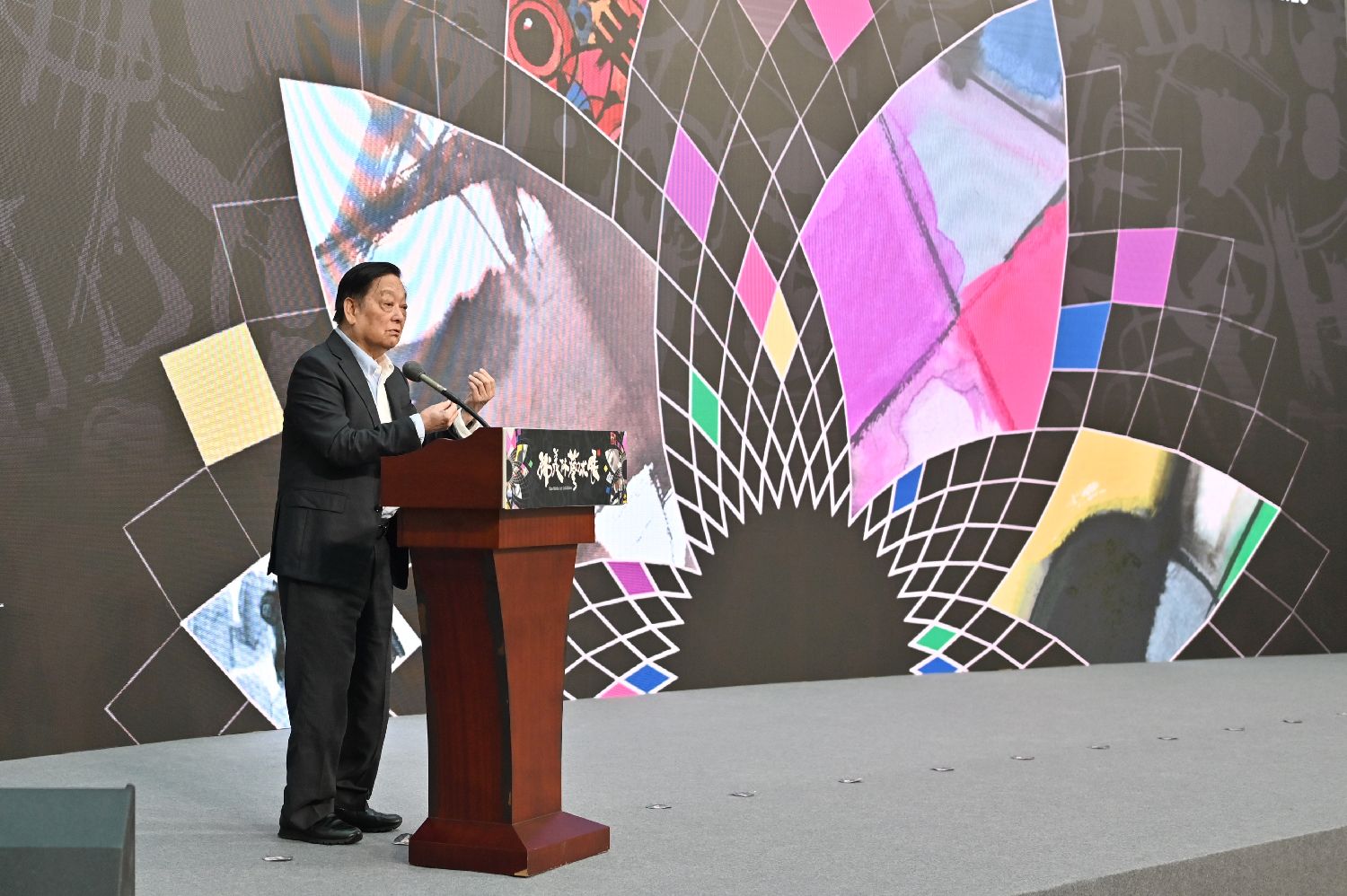 12月9日,“韩美林艺术展”在广州艺术博物院(广州美术馆)开幕。本次展览共展出艺术家韩美林的书法、绘画、雕塑、陶瓷、紫砂等作品300余件,引导观众步入韩美林的艺术花园。图为韩美林在开幕式上发言。中新社