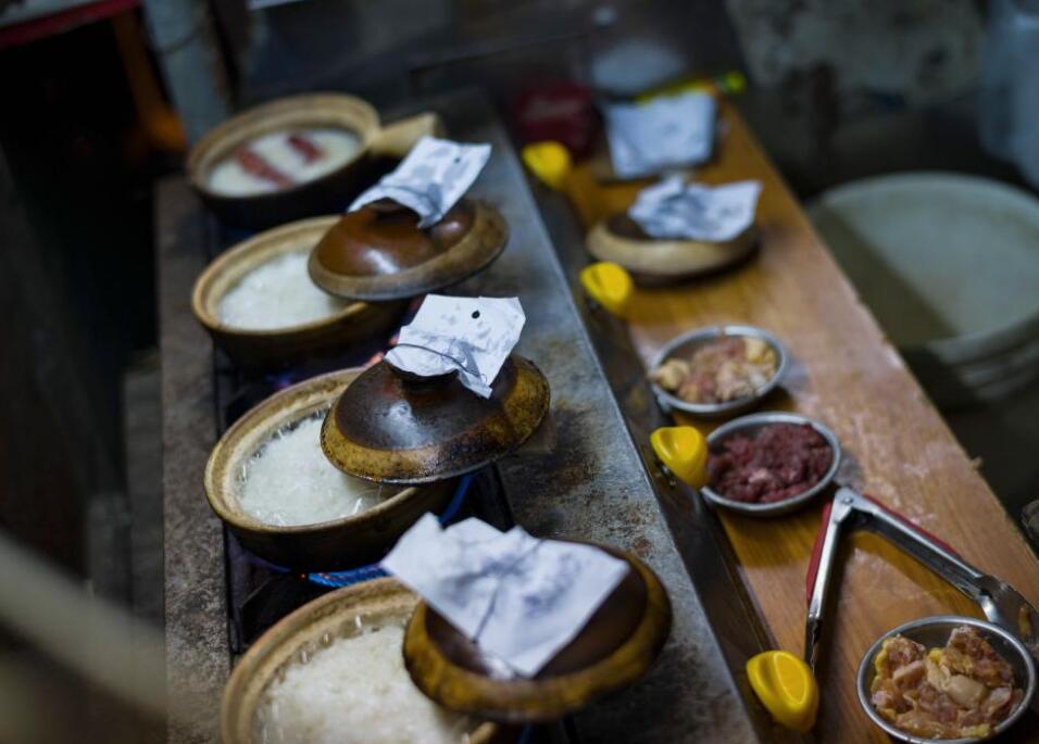 12月8日,在澳门新马路草堆街的南记煲仔饭,员工在制作煲仔饭。