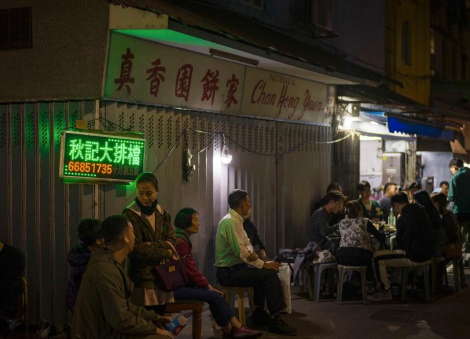 12月8日,在澳门十月初五街的秋记大排档,人们在排队等位。