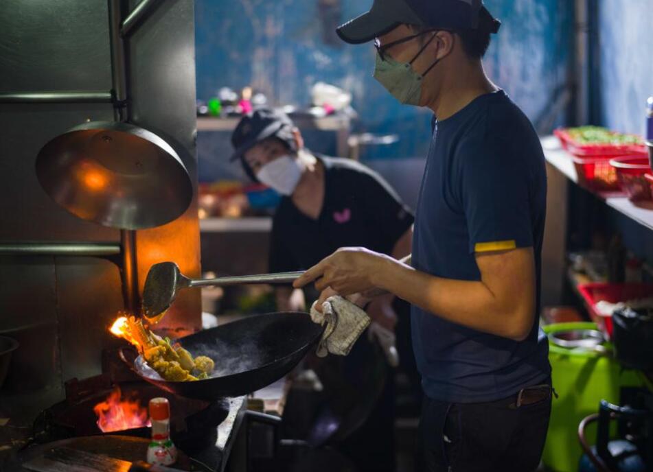 12月8日,在澳门十月初五街的秋记大排档,员工在炒菜。