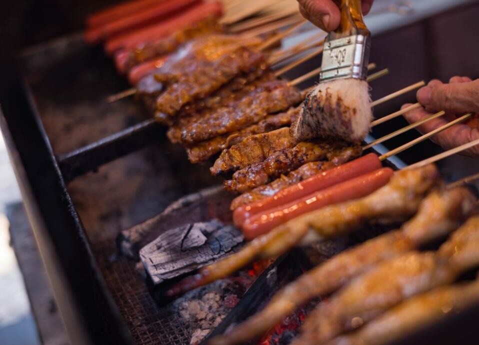 12月8日,在澳门营地大街的金记烧烤,员工在刷烤肉酱。