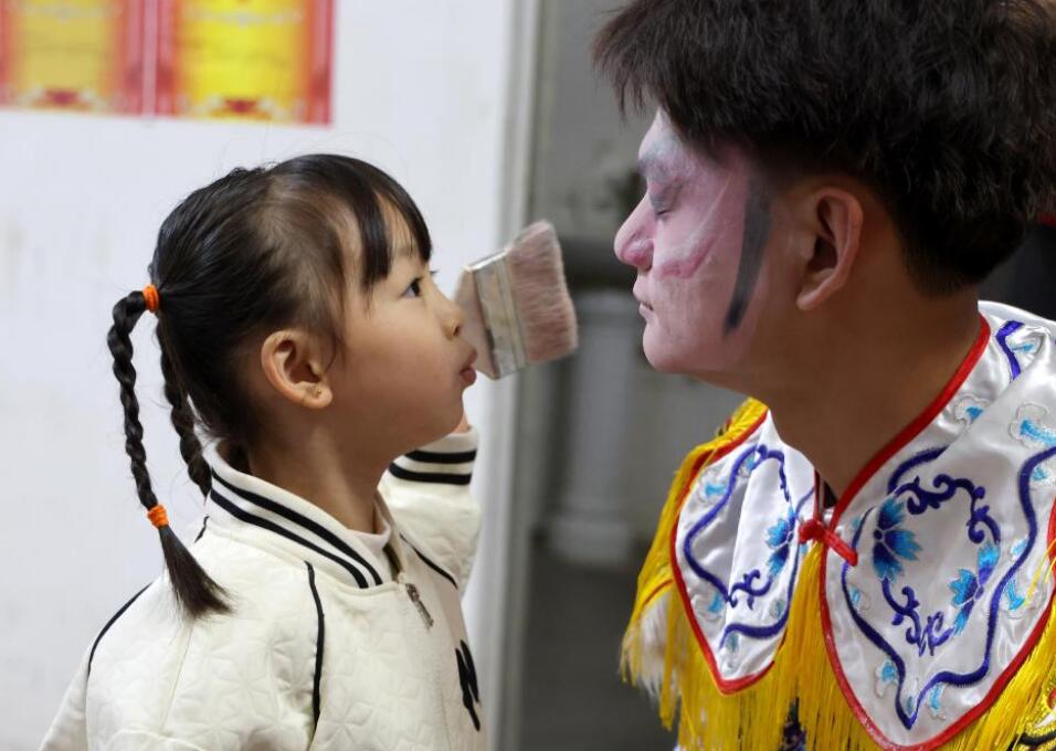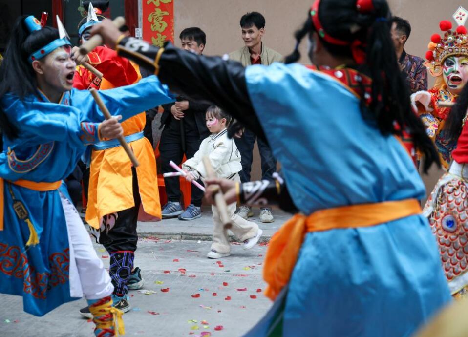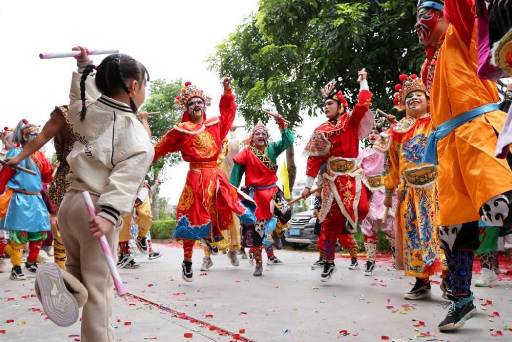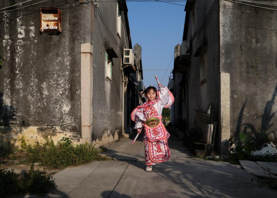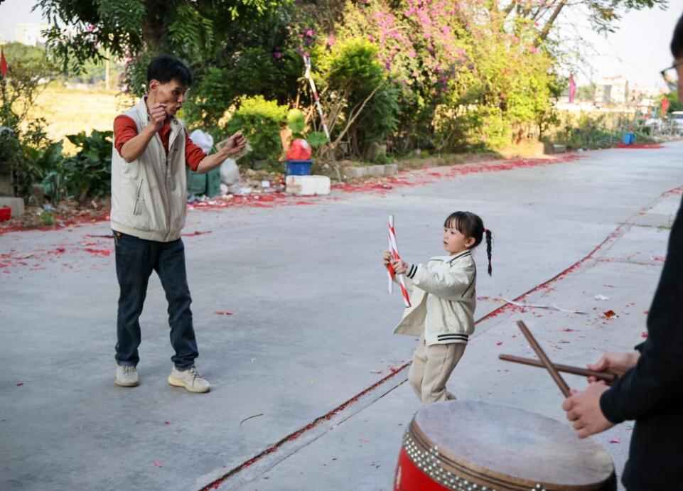 12月9日,广东省汕头市潮阳区贵屿镇玉窖村举办民俗活动,5岁女童庄恩琪手持英歌槌,跟随鼓点节奏与当地的英歌队员一同起舞,动作有力且充满韵律,赢得了在场观众阵阵掌声。庄恩琪来自一个英歌世家,爷爷庄壮标曾是英歌队中的海螺手,爸爸庄镕强是鼓手。受家庭影响,庄恩琪自小就对英歌产生了浓厚兴趣,常跟着爸爸到训练场学习。今年年初,庄恩琪因一则短视频走红网络,她灵动有力的英歌表演赢得了许多网友的喜爱和关注。图为12月9日,庄恩琪在路边与巡游中的贵屿镇后望村英歌队互动。