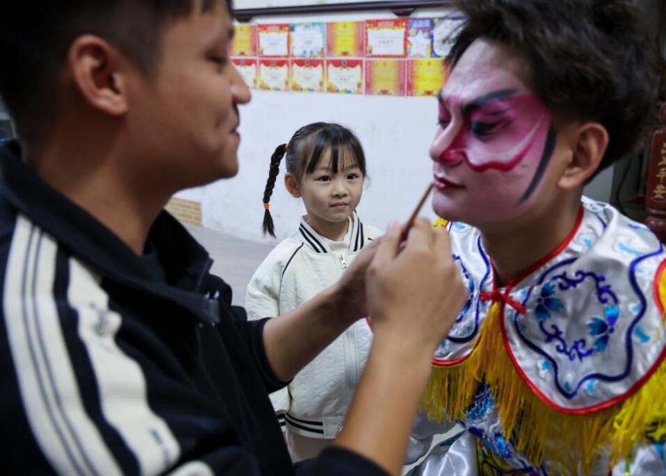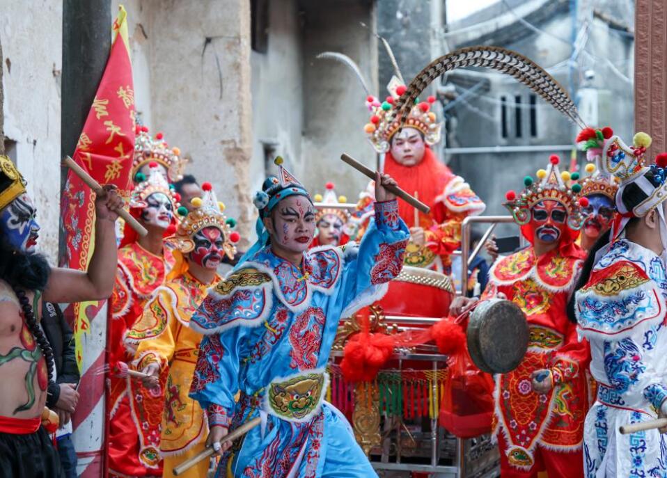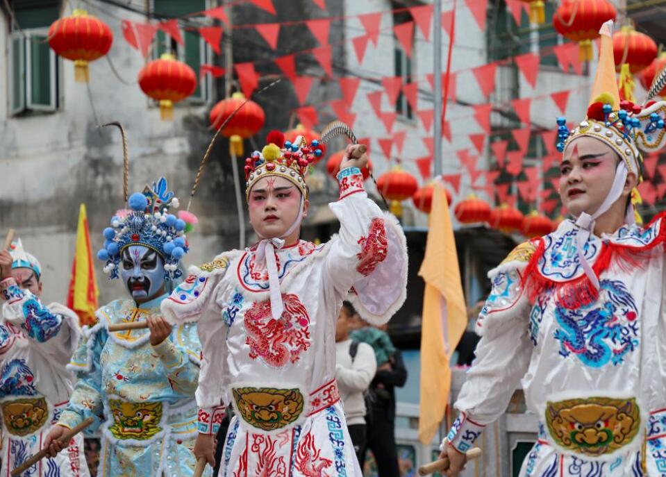 英歌是广东潮汕地区的传统民俗舞蹈,融汇戏剧、舞蹈、武术等多种元素于一体,表演气势澎湃,又被称为“中华战舞”,2006年入选首批国家级非物质文化遗产名录。图为12月9日,庄恩琪在路边与巡游中的贵屿镇后望村英歌队互动。