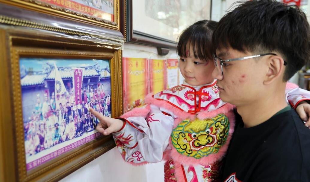12月9日,爸爸抱着庄恩琪看爷爷2008年参加英歌队时的合影。