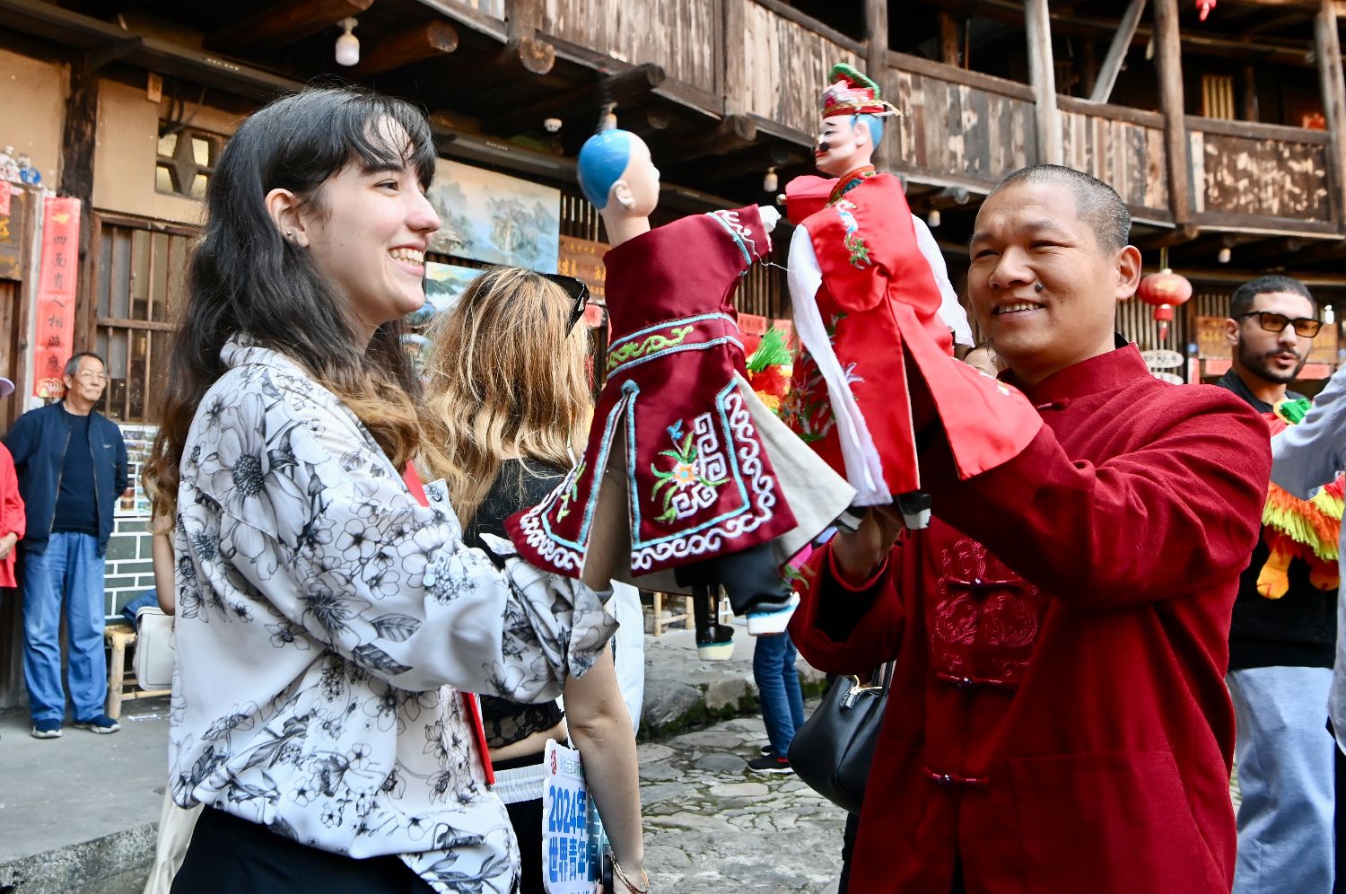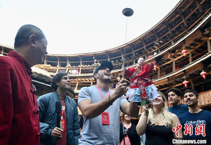 世界青年学生在土楼里体验掌中木偶戏。中新网