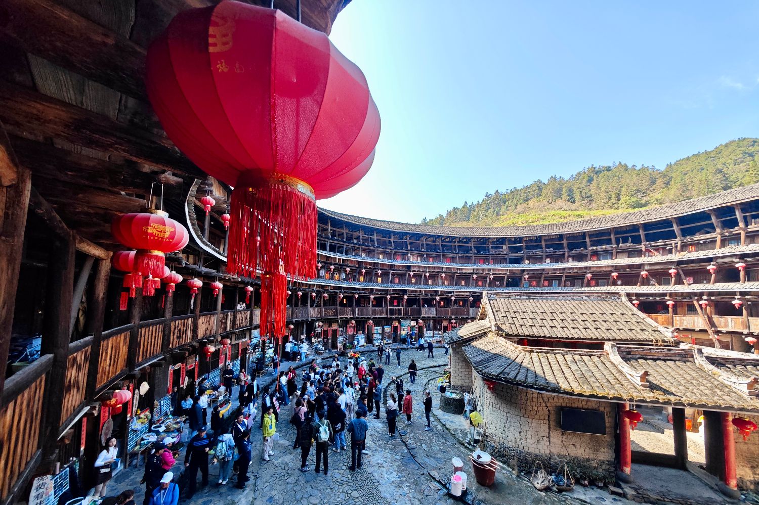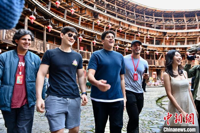 世界青年学生在土楼里欢乐游逛。中新社