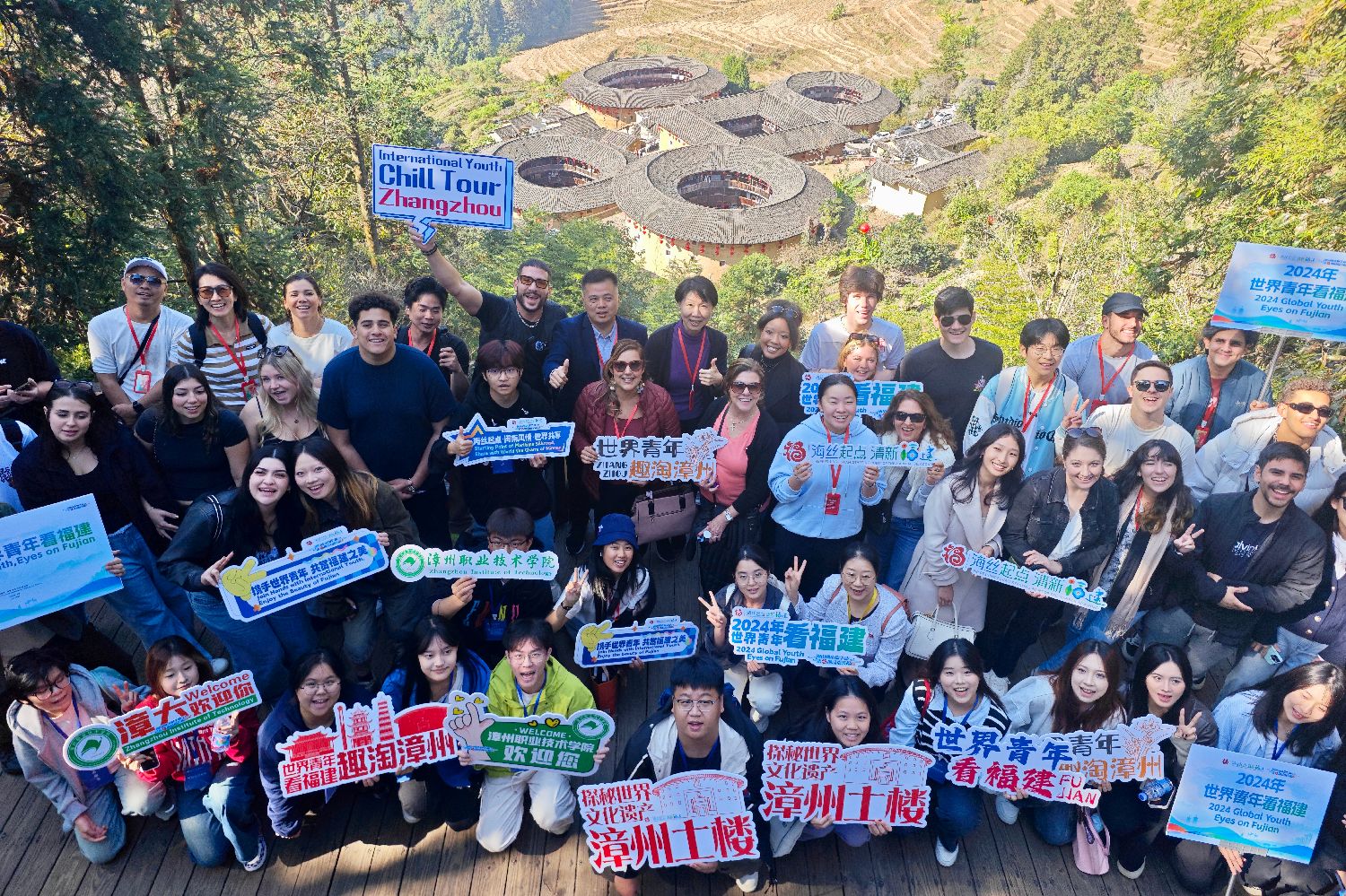 12月11日,参加“2024年世界青年看福建”的世界青年学生代表走进福建省漳州市南靖县,领略土楼魅力,感受当地风土人情。图为世界青年学生与中方陪同人员合影。中新社