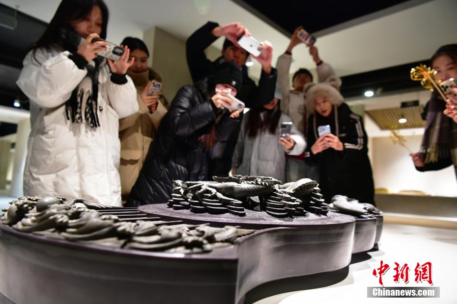 12月12日,游客在易县博物馆参观易水砚巨砚“中华巨龙腾飞砚”。中新社