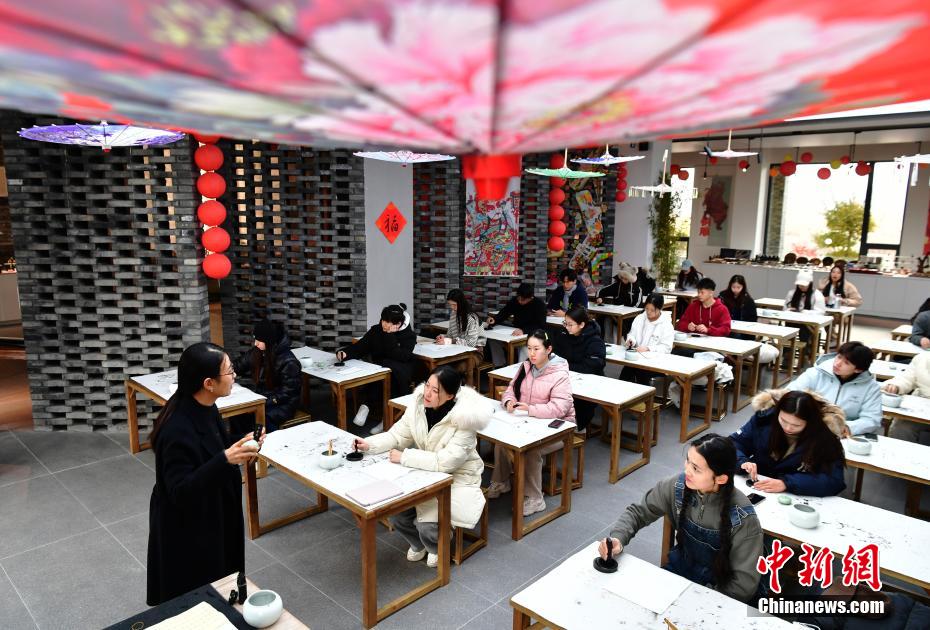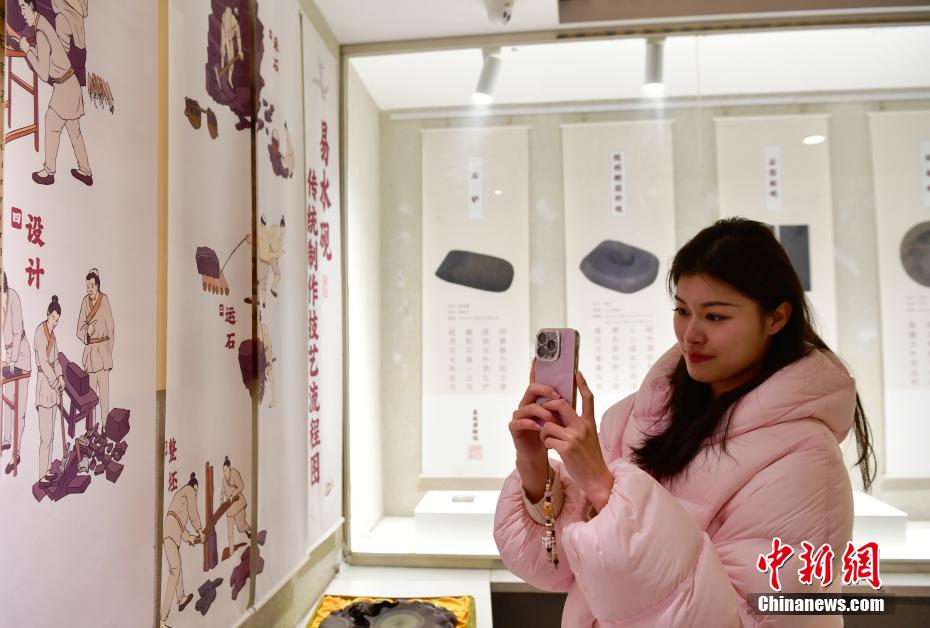 易水砚产于河北省易县。相传易水砚始于战国,盛于唐宋,与端砚齐名,有“南端北易”之说。2008年,易水砚制作技艺被列为中国国家级非物质文化遗产,砚雕大师邹洪利被确定为这一非遗技艺的代表性传承人。十多年过去了,如今邹洪利的女儿邹天然接过了接力棒。邹天然为易水砚文化的传承与发展注入了新活力。她创新设计的手把砚、文博文创砚等系列砚,在中国文房四宝艺术博览会上获得多枚金奖。易水砚远销法国、日本、韩国、新加坡等多个国家和地区。图为12月12日,大学生参观易砚博物馆,了解易水砚制作流程。中新社