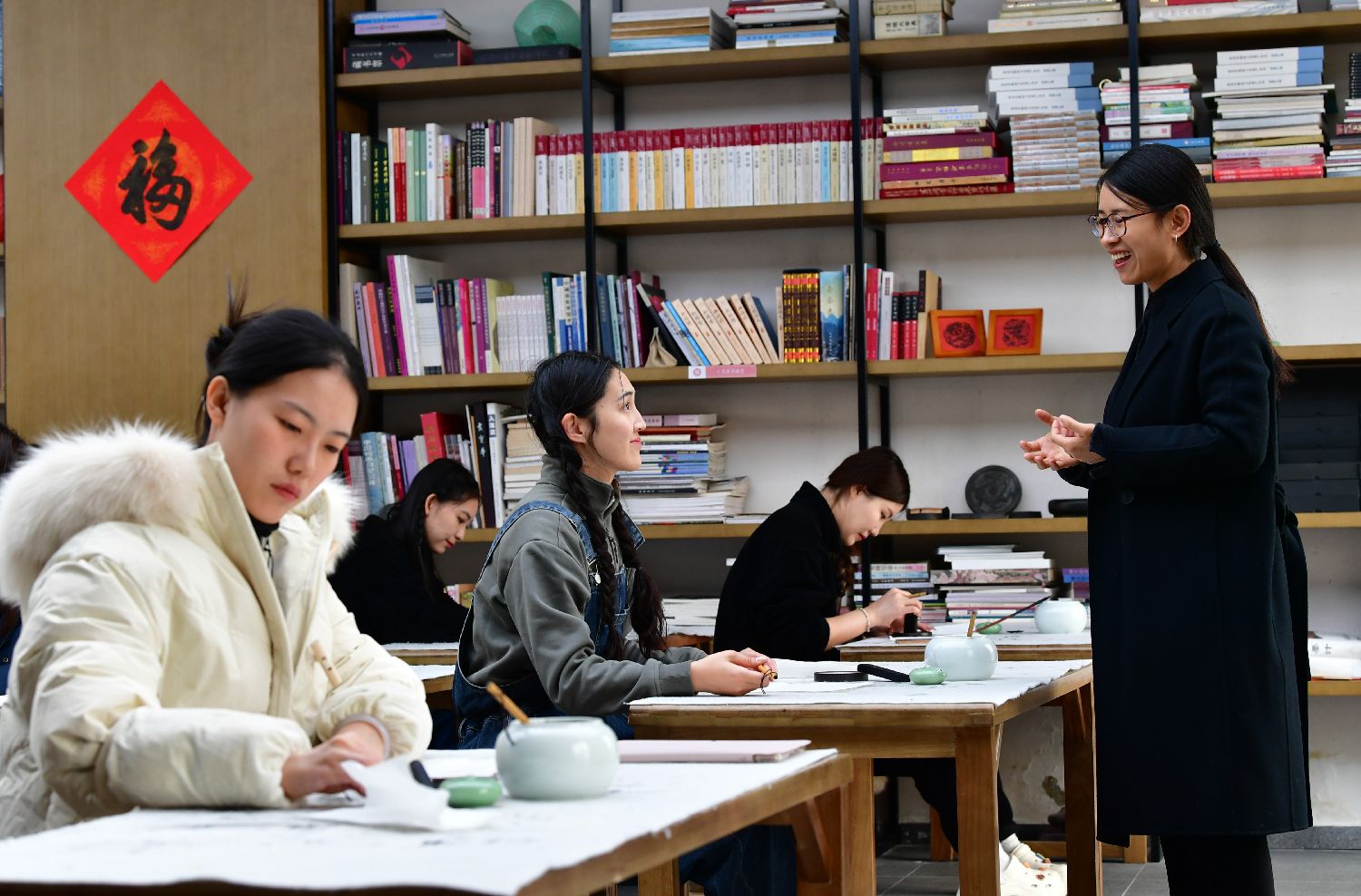 12月12日,邹天然(右一)在易水非遗体验馆指导研学活动。中新社