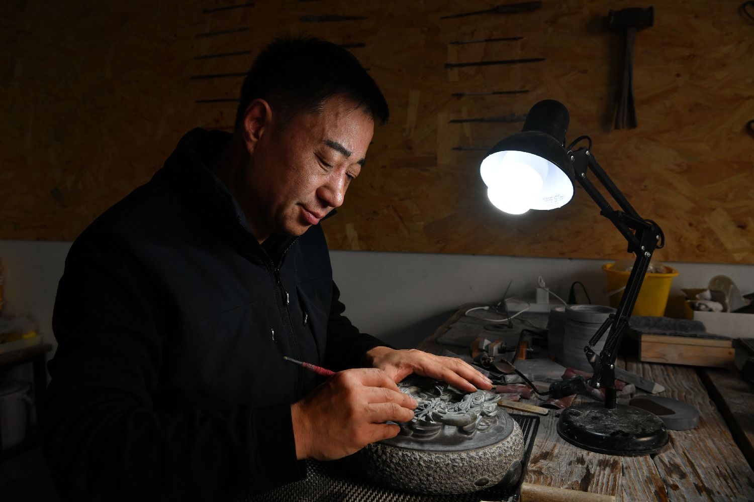 12月12日,邹洪利创作易水砚。中新社