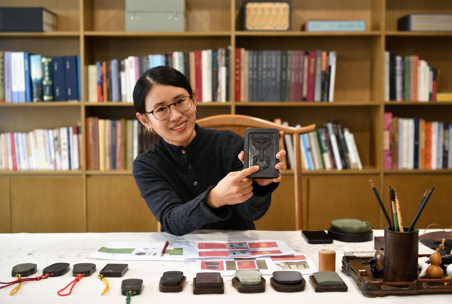 12月12日,邹天然展示文博文创砚。中新社
