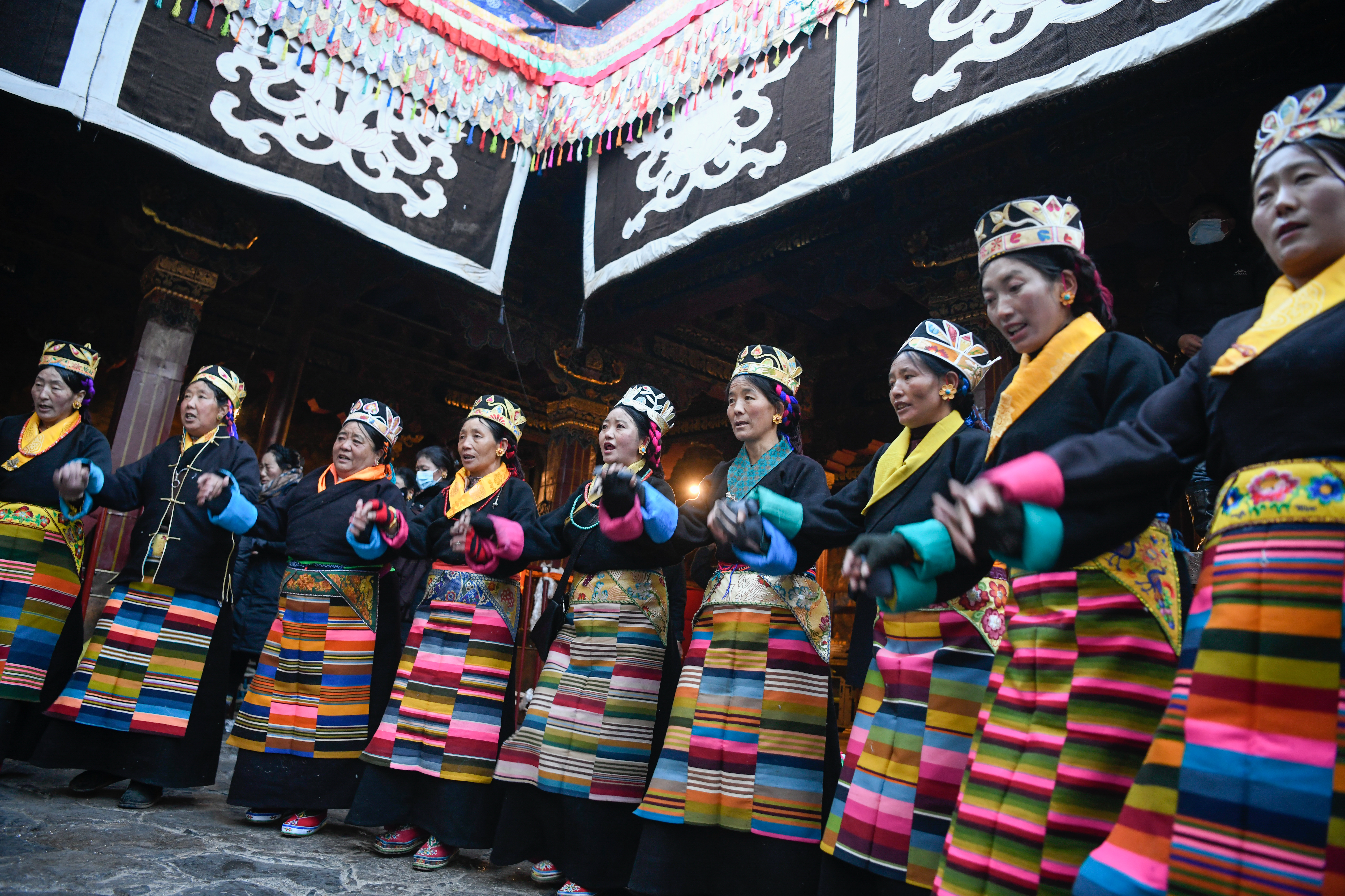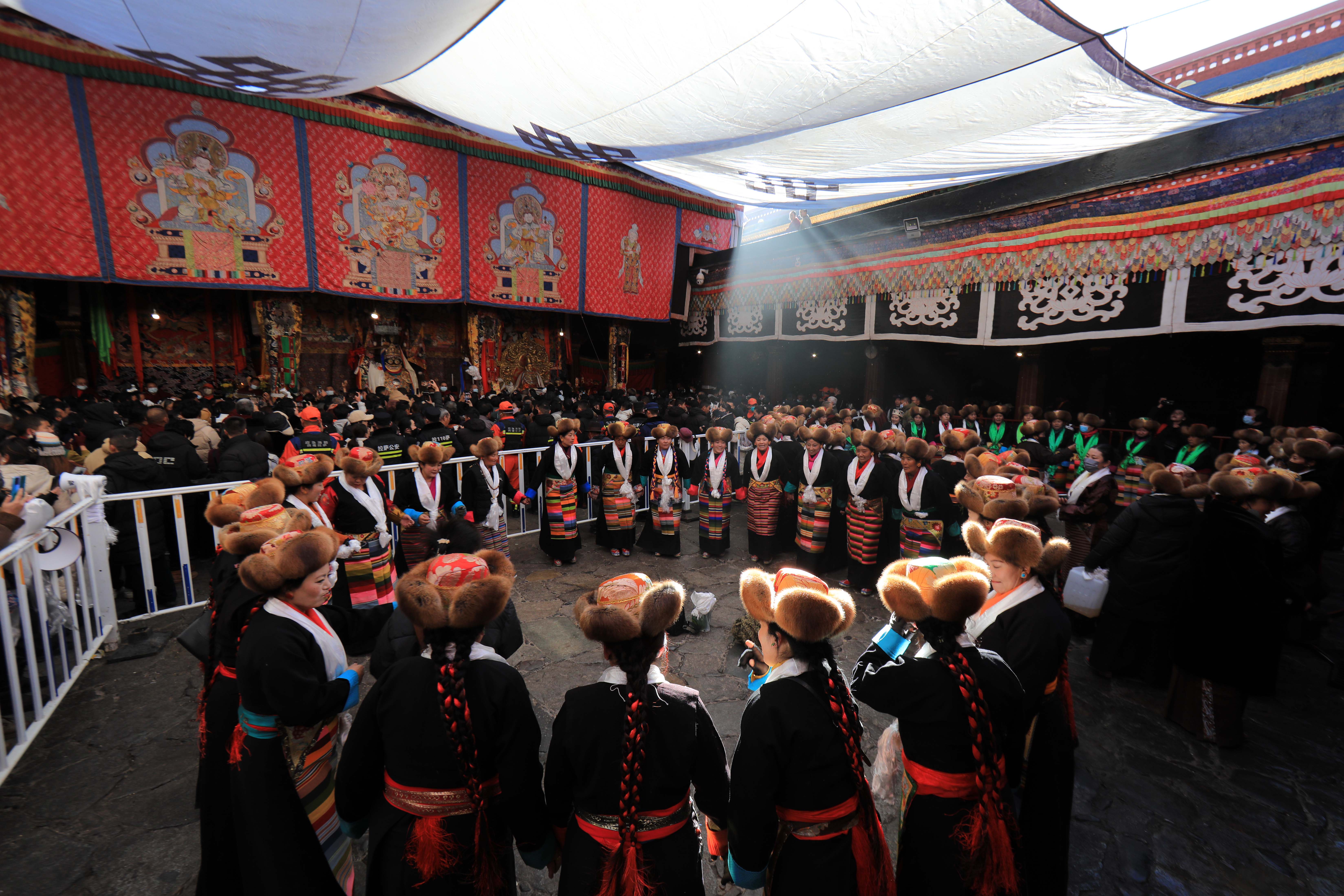 12月15日,身着民族服装的信众在大昭寺内载歌载舞。中新社
