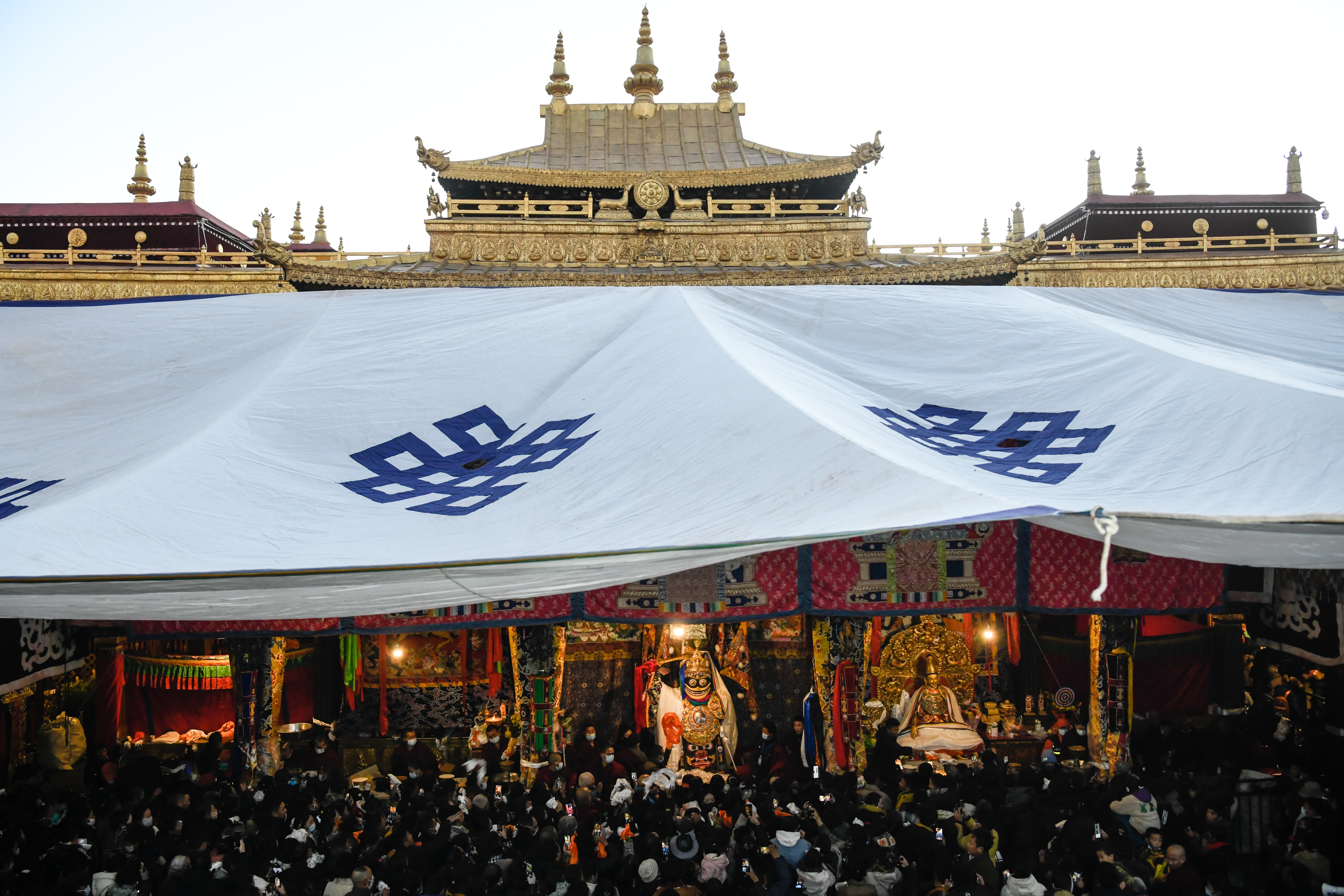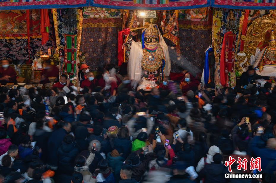 12月15日,藏历十月十五日,这一天是西藏的传统民俗节日“白拉姆节”,也被称为“仙女节”。当日,信众们穿着节日盛装,手捧哈达、鲜花、水果、青稞酒等供品前往大昭寺,面对寺内的白拉姆和赤尊赞神像,双手合十虔诚地祈福并敬献供品,祈愿来年丰收、无灾无病。相传藏传佛教最高护法神之一班丹拉姆的女儿白拉姆,不顾母亲的反对与赤尊赞私定终身,班丹拉姆一怒之下将赤尊赞赶到拉萨河南岸,规定二人仅每年的藏历十月十五日相见。图为信众在大昭寺欢度“仙女节”。中新社