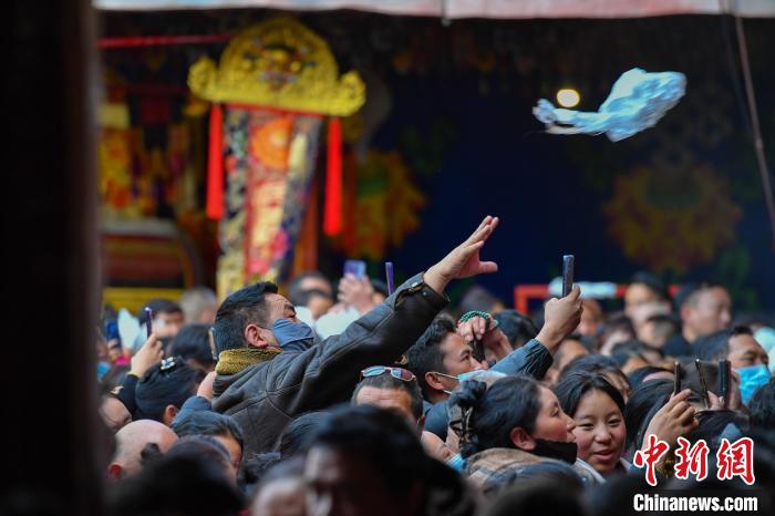 12月15日,信众在大昭寺抛献哈达,祈福。中新网
