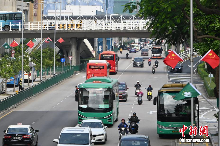 12月15日,澳门街头悬挂旗帜。香港中通社