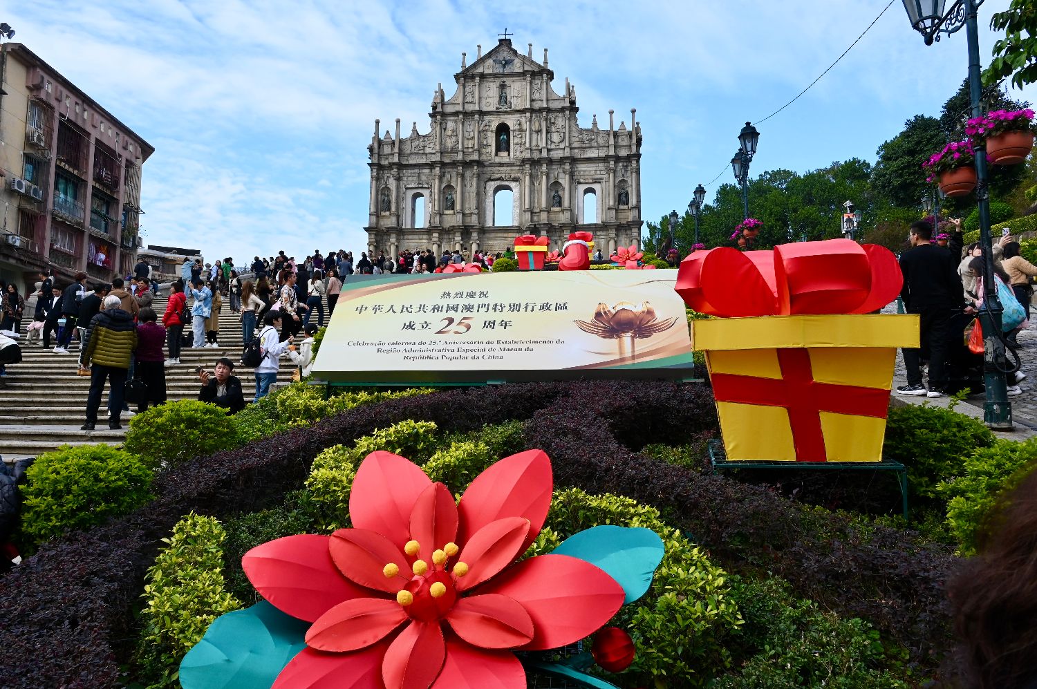 澳门回归25周年纪念日即将到来。连日来,在澳门街头随处可见迎回归的大型装置、主题花坛、宣传标语,五星红旗及特区区旗随风飘扬,气氛浓厚。图为澳门大三巴牌坊的大型迎回归装置。中新社
