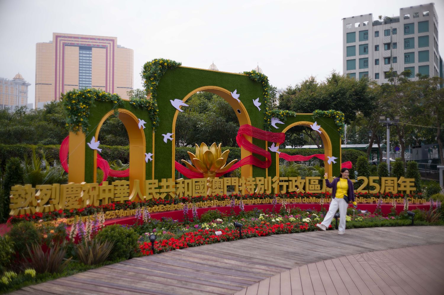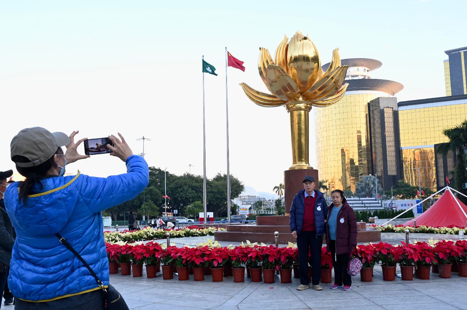 12月16日,游客在澳门回归纪念日前夕参观金莲花广场。中新社