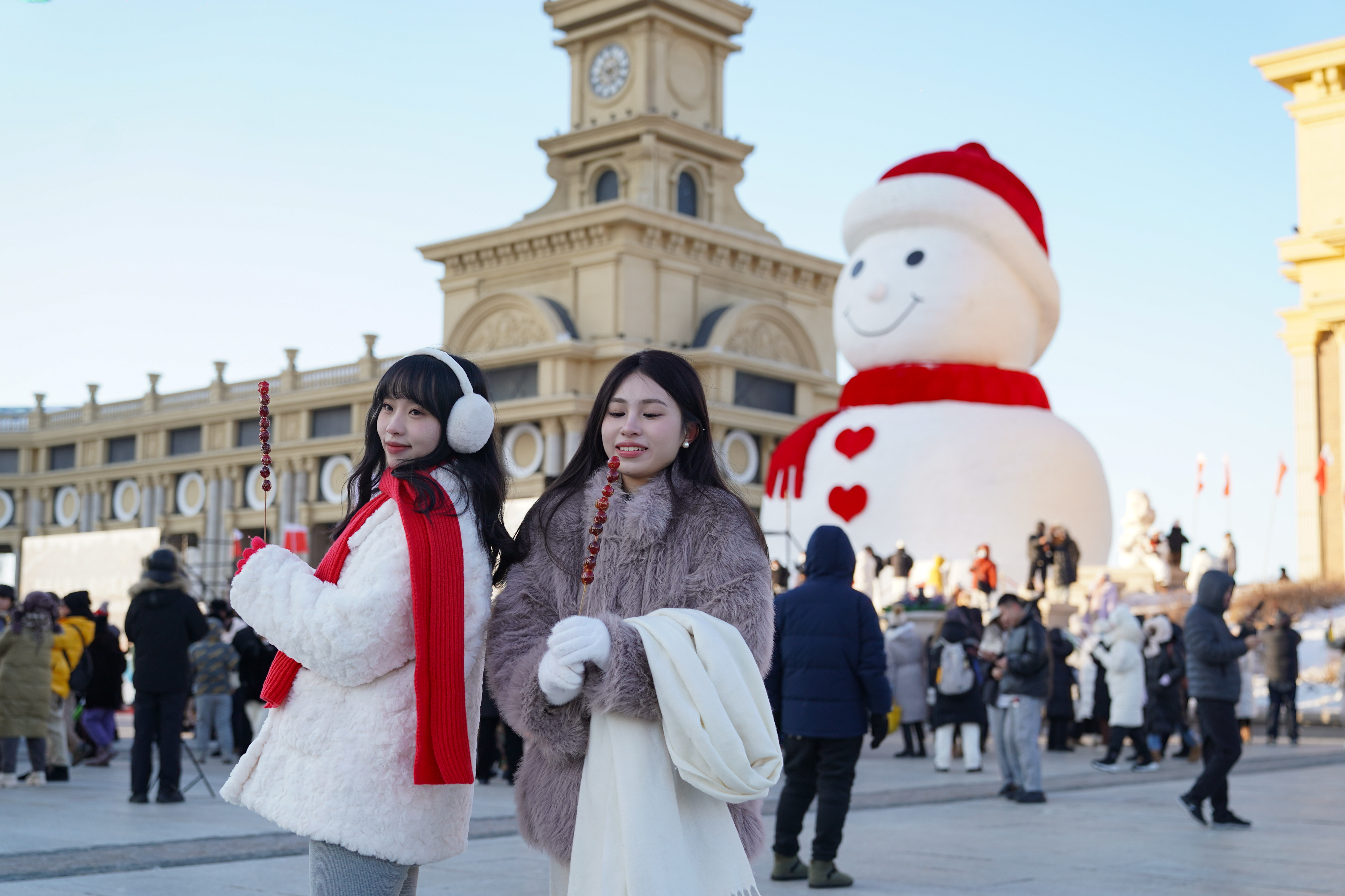 12月17日,黑龙江哈尔滨2024年网红“大雪人”在历时12天的建造后成功亮相。同日,吉林长春冰雪新天地开门迎客。中国东北地区冷资源乘“冬”风蓄力“加热”,让游客过足冰雪瘾。图为12月17日,游客与哈尔滨大雪人合影。中新社