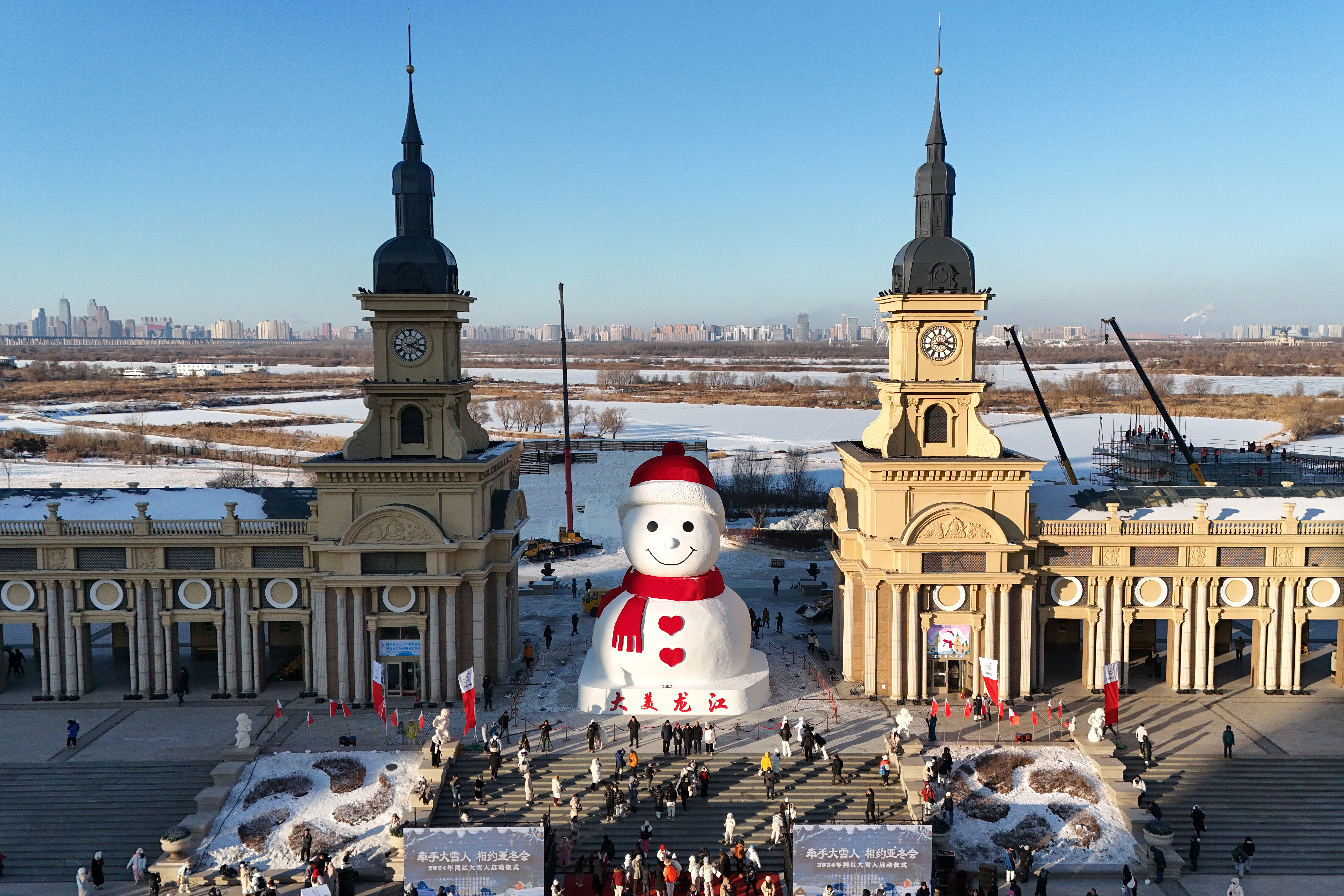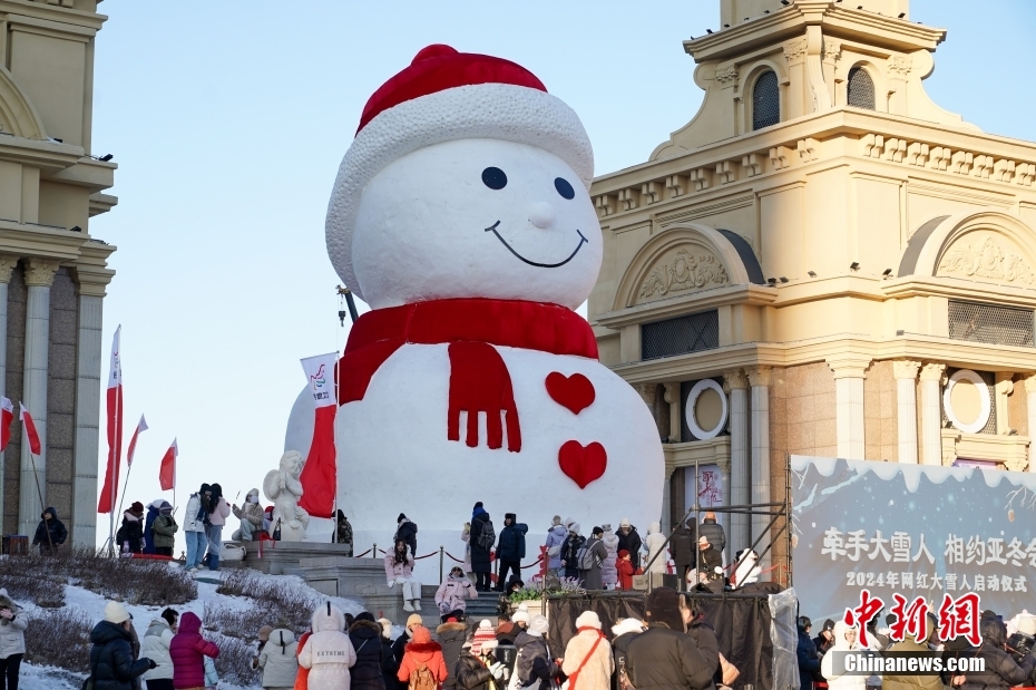 12月17日,“牵手大雪人相约亚冬会”2024年网红“大雪人”启动仪式在黑龙江哈尔滨群力音乐公园举行。今年的大雪人用雪量约2000立方米,高约18米,延续往年的红帽子、红围脖、红色爱心纽扣造型。中新社