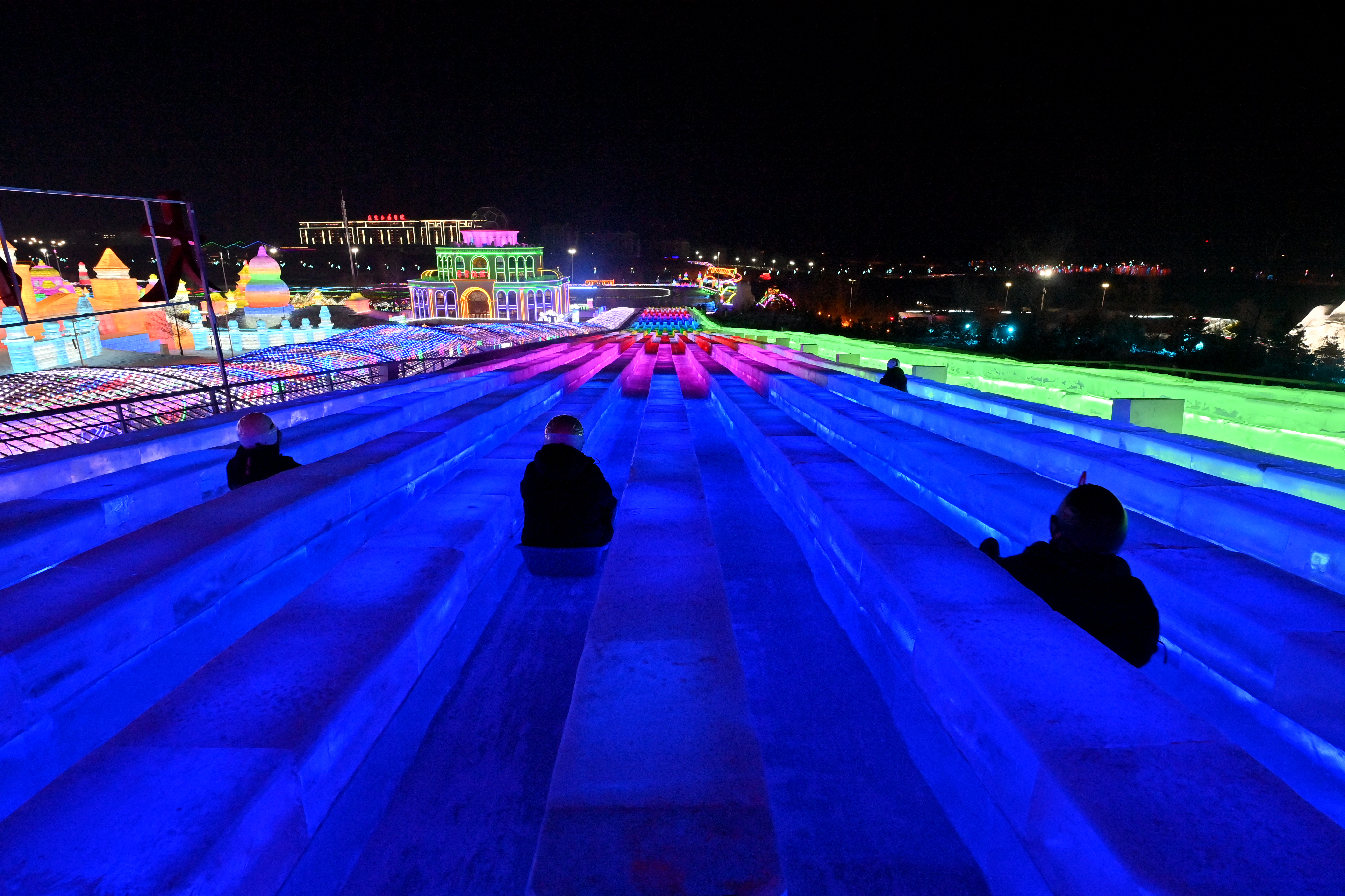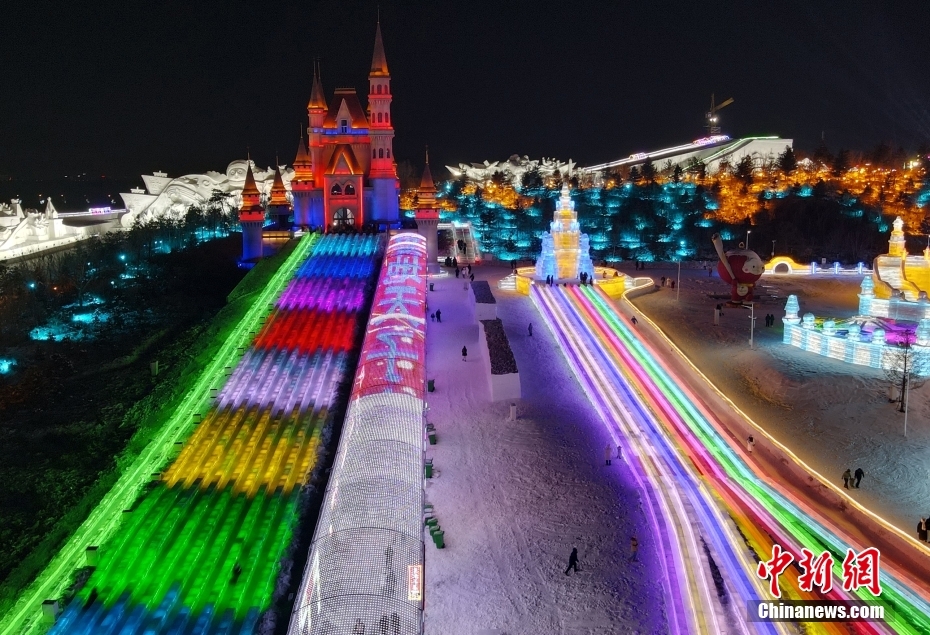 12月17日晚,长春冰雪新天地开门迎客,520米超长冰滑梯亮相,吸引游客体验。中新社