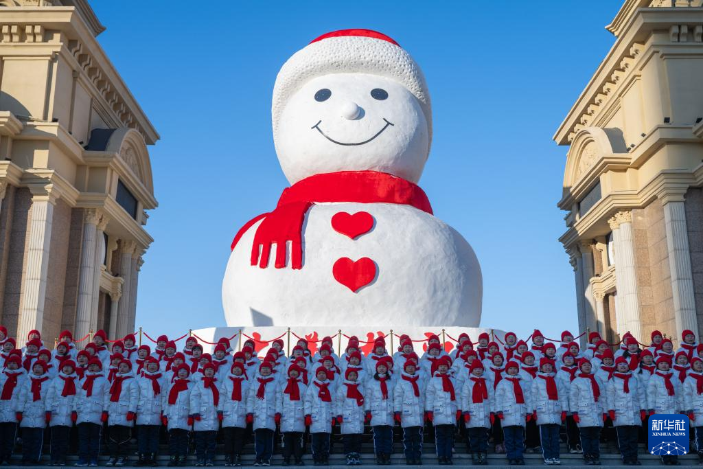 12月17日,小学生在哈尔滨松花江畔的大雪人前表演。新华社