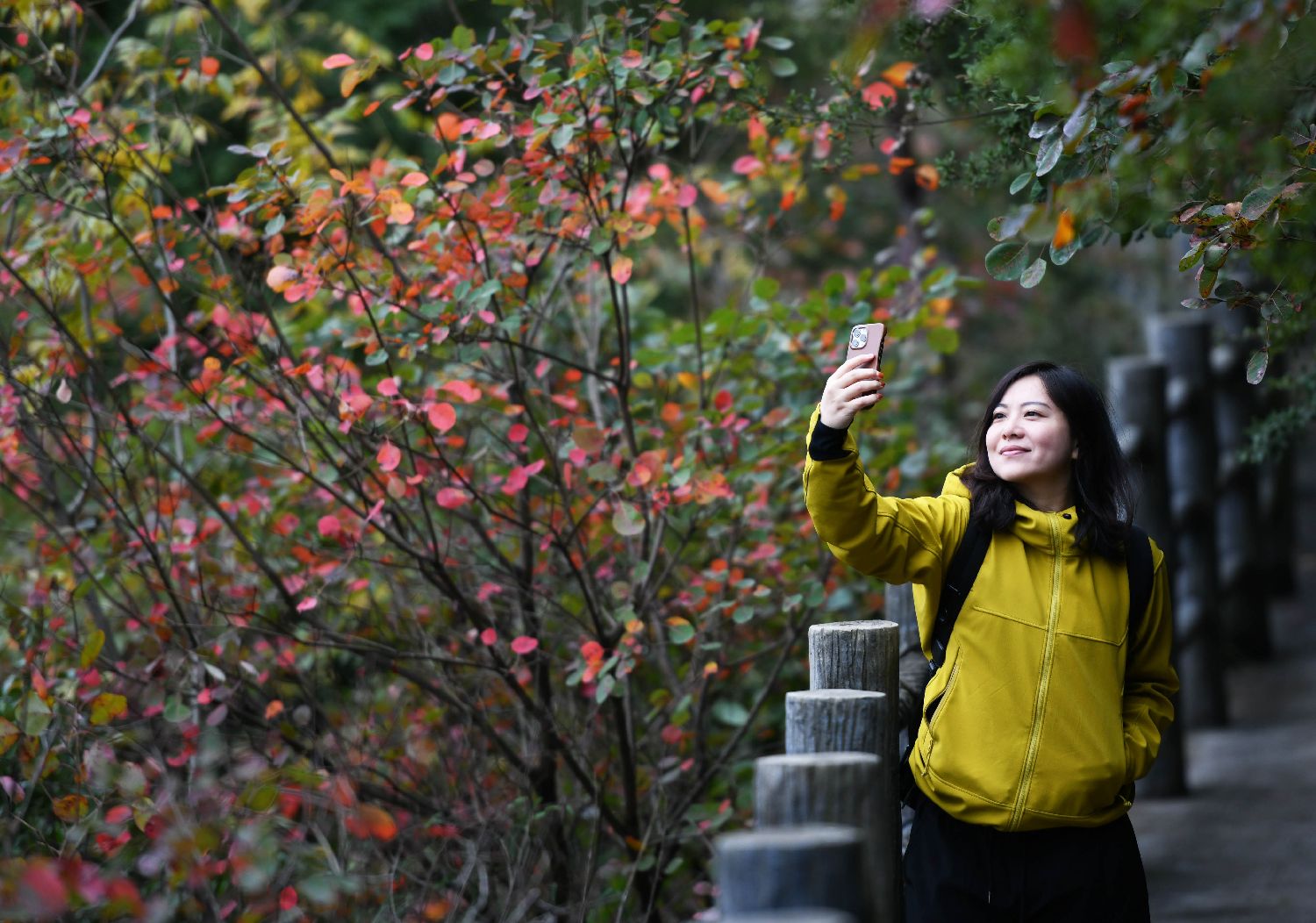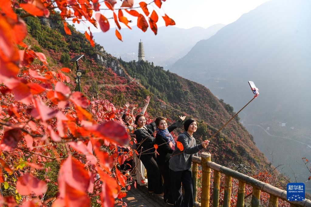 12月18日,游客在重庆巫山三峡龙脊景区游览、拍摄红叶。新华社