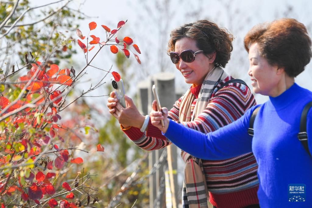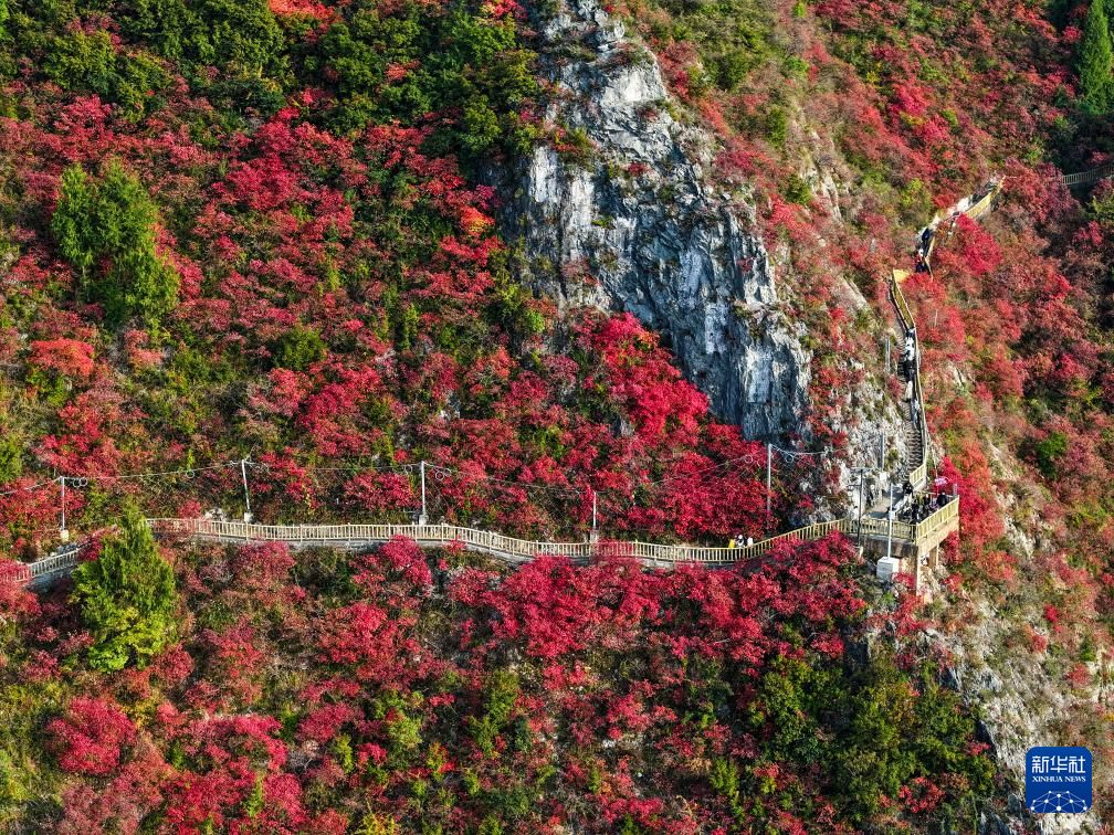 近年来,巫山县结合“两岸青山·千里林带”建设总体方案,大规模栽植黄栌、枫香、乌桕、三角枫等红叶景观树种,持续打造三峡红叶景观带。同时,当地以红叶为媒,通过举办巫山红叶节等举措,不断提升巫山红叶的观赏性和美誉度,有力助推文旅产业发展。图为11月17日,长江巫峡神女景区的红叶吸引游客驻足拍照留念。中新社