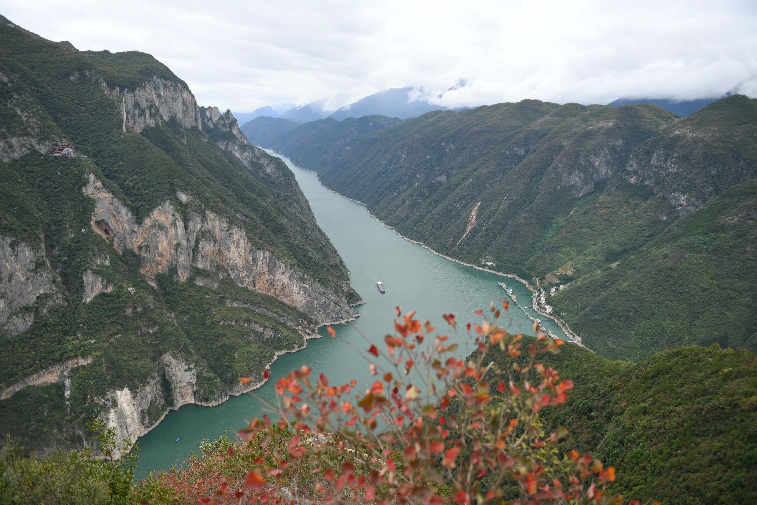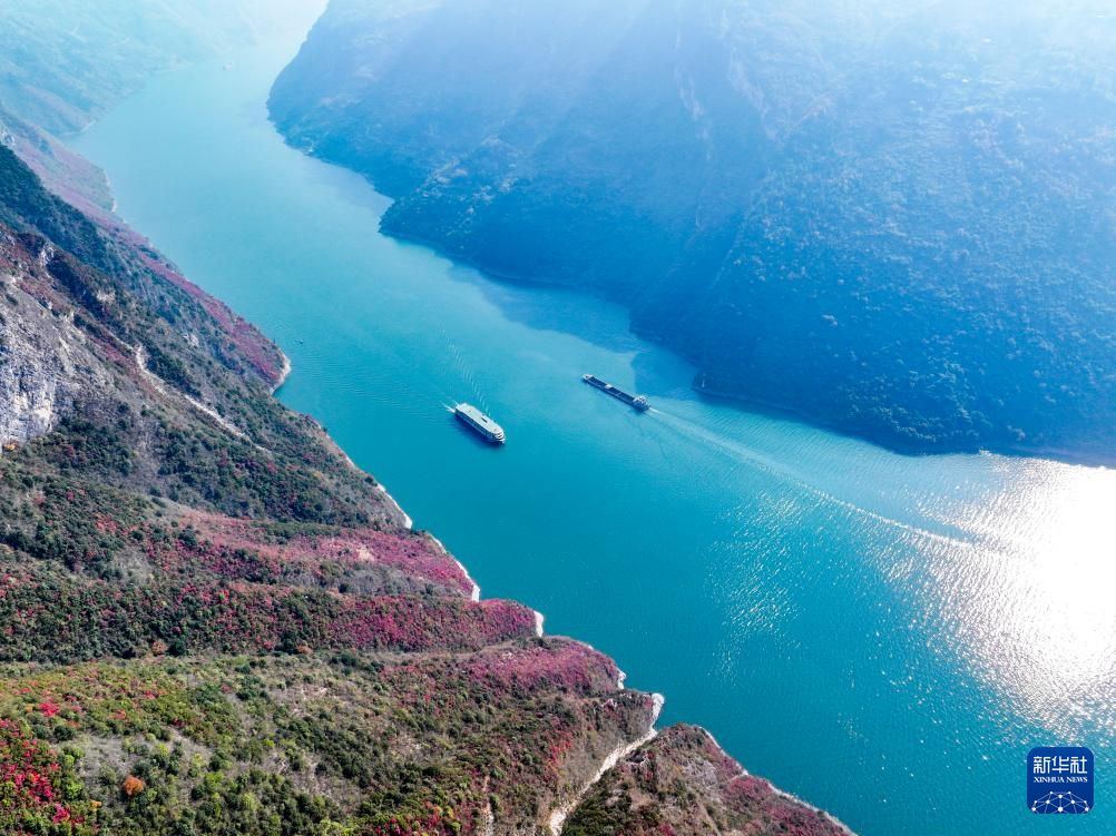 山水红叶交相辉映,呈现一个如诗如画的世界。图为12月18日,轮船行驶在长江巫峡段。新华社