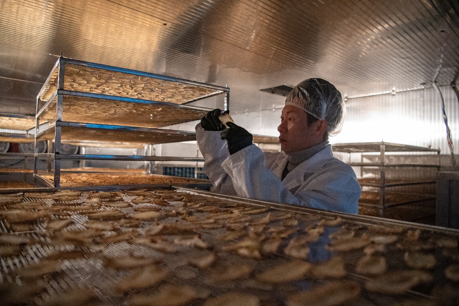12月18日,在波密县高原藏天麻产业开发有限公司,工人在查看藏天麻烘干情况。中新社