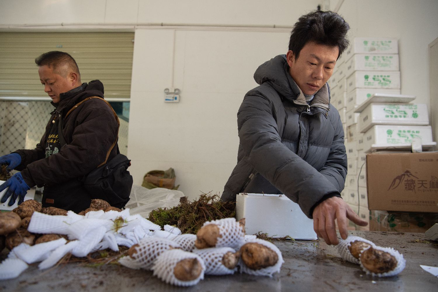 12月18日,工作人员在包装藏天麻。中新社