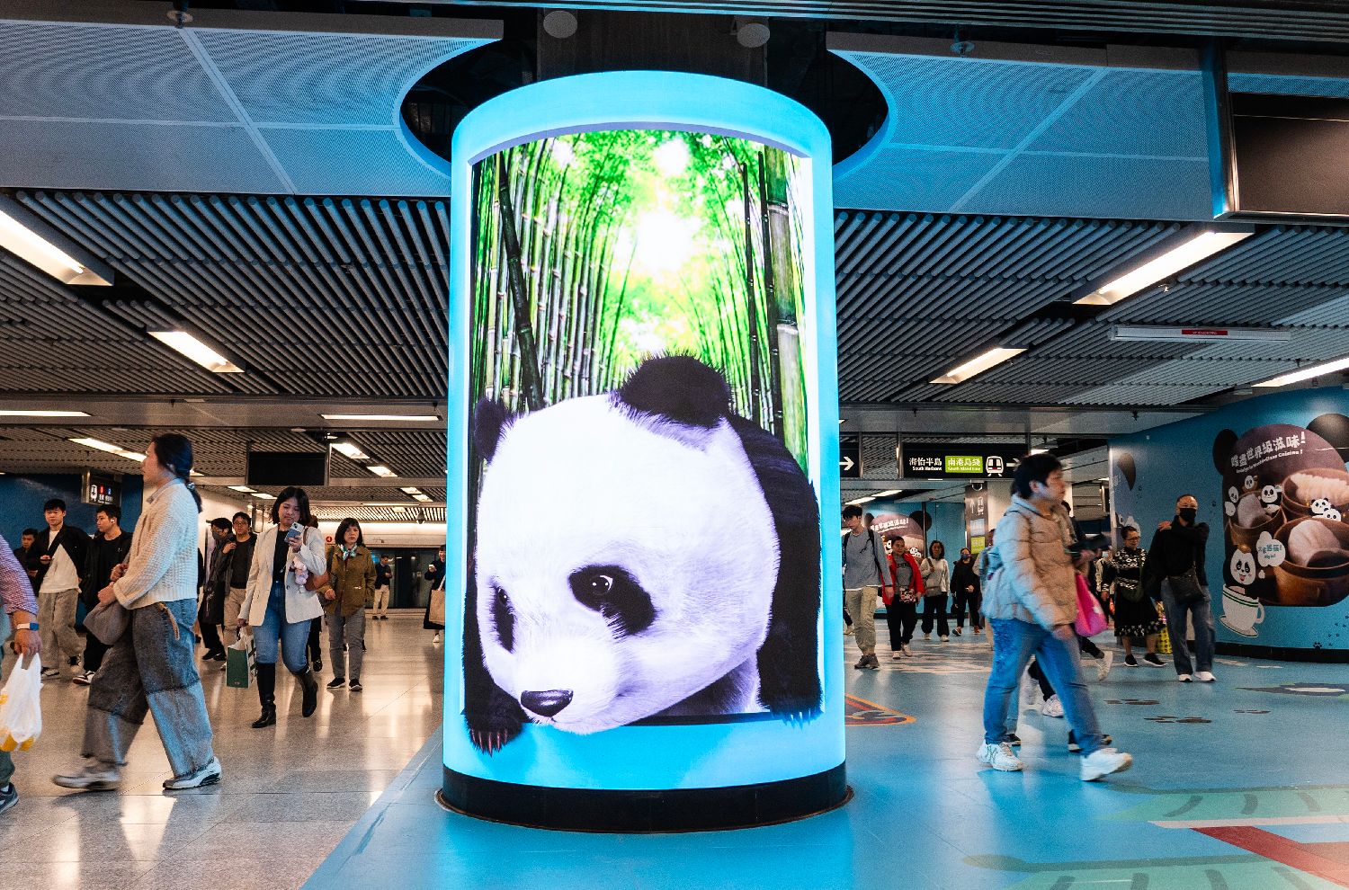 12月19日,伴随香港的“大熊猫热潮”,港铁公司(MTR)推出大熊猫主题车站、主题列车等“大熊猫畅游MTR”系列宣传活动,即日起至2025年2月期间,金钟站和海洋公园站将被大熊猫主题装饰“扮靓”,三列“大熊猫主题列车”将行驶于南港岛线和机场快线,令市民游客有机会享受大熊猫的萌趣和欢乐。图为金钟站换乘通道的大熊猫主题LED显示屏。中新社