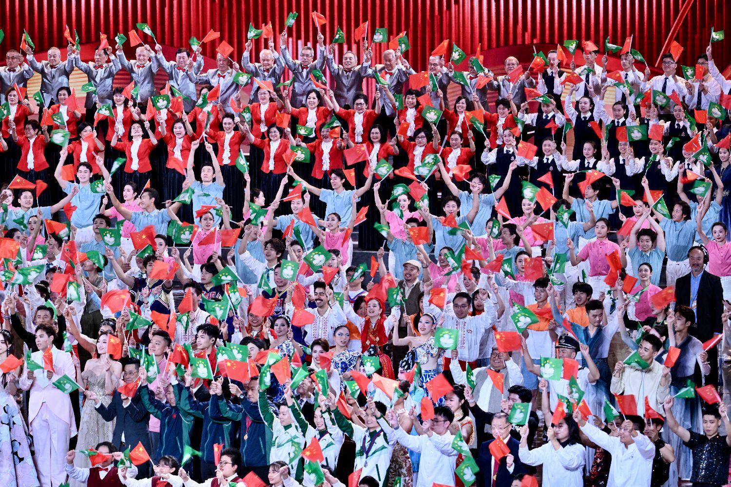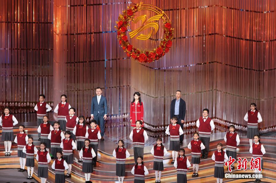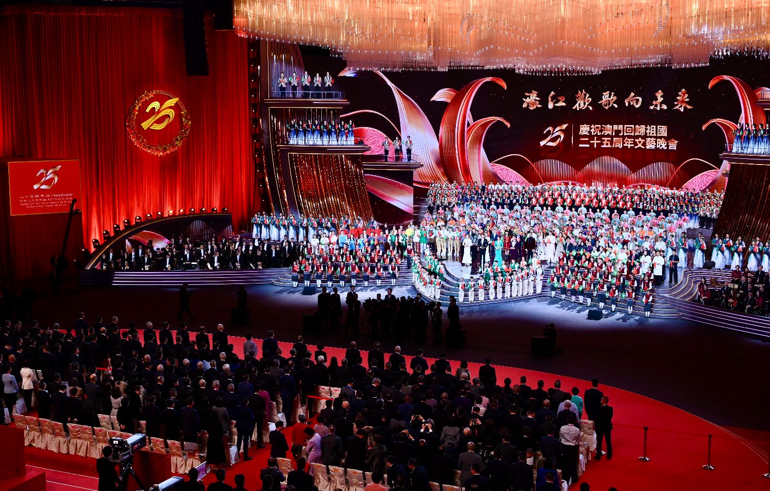 12月19日,由澳门特别行政区政府文化局和中央广播电视总台文艺节目中心共同承办的“濠江欢歌向未来——庆祝澳门回归祖国二十五周年文艺晚会”在澳门东亚运动会体育馆举行。演出现场灯光璀璨,欢乐喜庆。图为文艺晚会上全场大合唱《歌唱祖国》。中新社