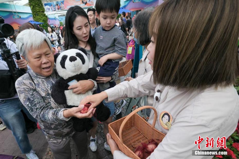 大熊猫“家姐”和“细佬”的百日宴当日,有婆婆抱着“大熊猫”玩偶领取红鸡蛋接受祝福。
