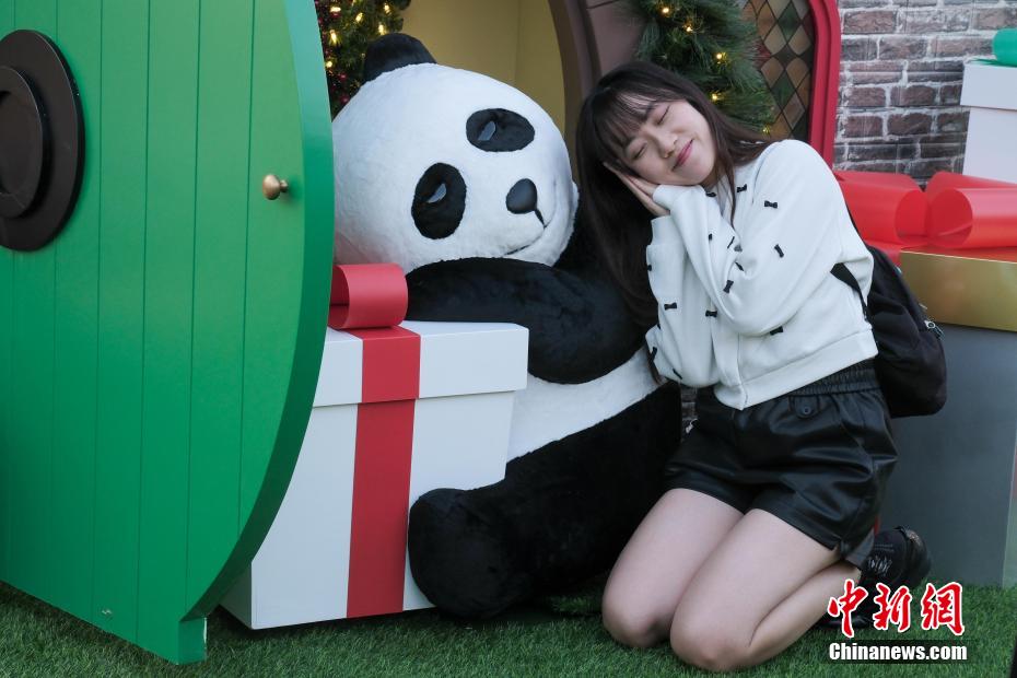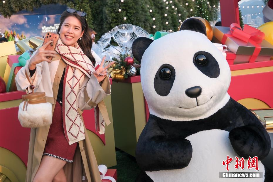 女士在香港西九文化区的冬日小镇活动上与可爱“大熊猫”玩偶合照。