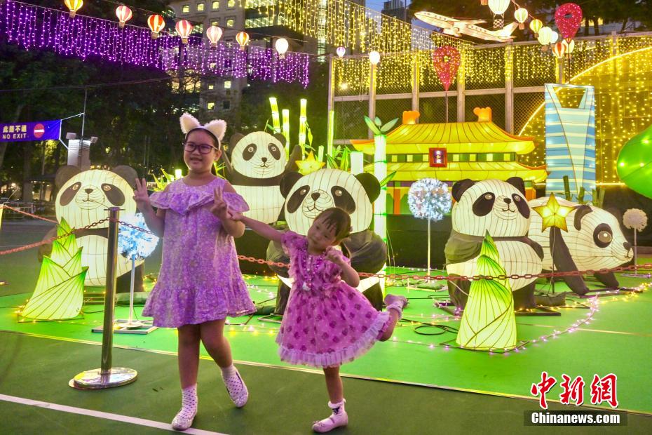 小朋友在维多利亚公园的中秋灯会上与“大熊猫”造型灯饰合照。