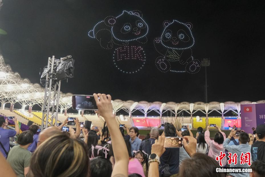 具有“大熊猫”元素的无人机表演吸引民众观看拍摄。