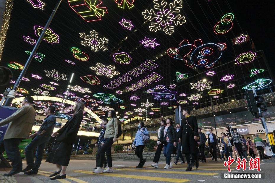 香港尖沙咀东一街道上空具有“大熊猫”元素的灯饰亮灯,气氛十足。