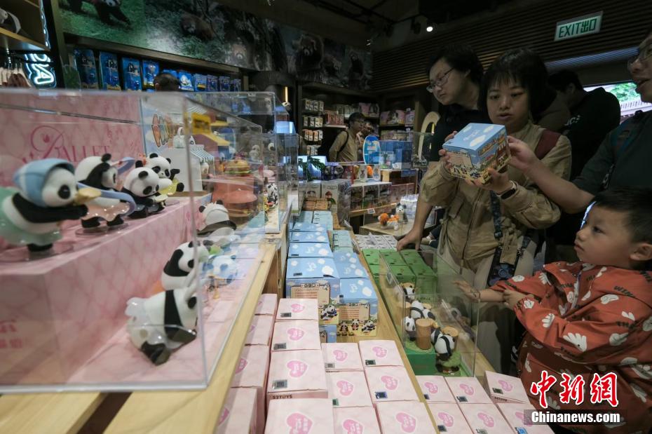 家长带着孩子在香港海洋公园选购“大熊猫”商品。