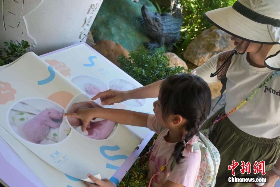 小朋友在海洋公园观看大熊猫宝宝“家姐”和“细佬”的成长日记。