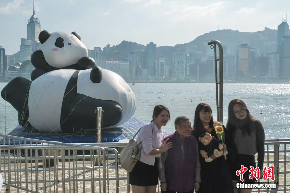 “大熊猫”的身影在香港随处可见。香港特区政府在多个大型节日已加入“大熊猫”元素,包括中秋灯会、无人机表演等;社会各界也推出“大熊猫”活动及相关产品。图为毕业生与“HELLOPANDAS熊猫驾到”户外嘉年华活动的水上巨型“大熊猫”装置合照。