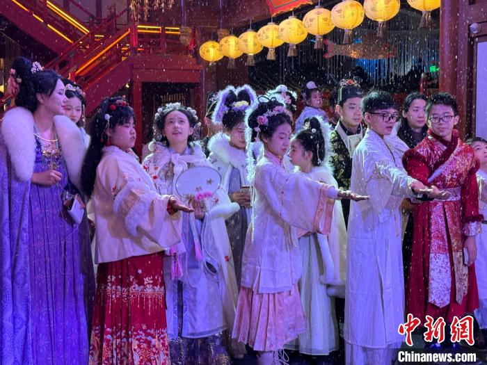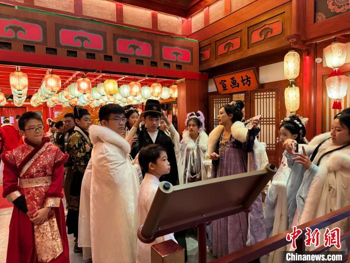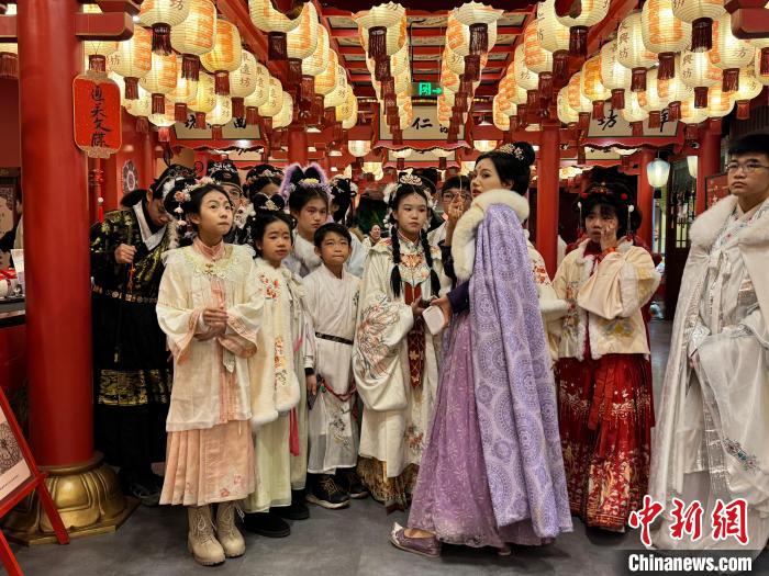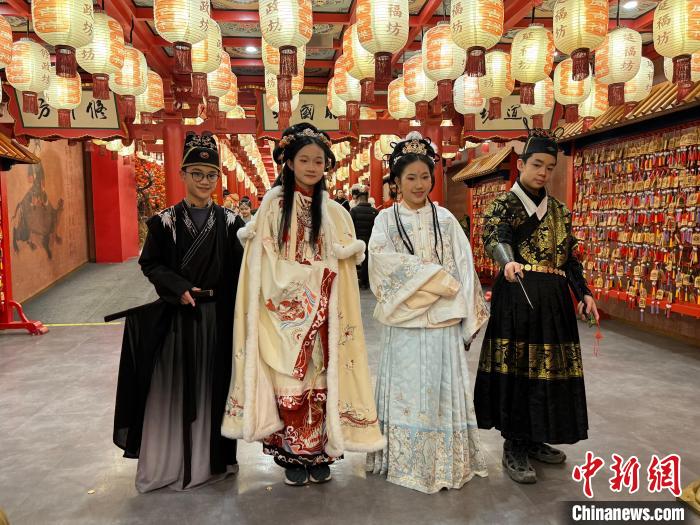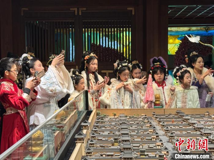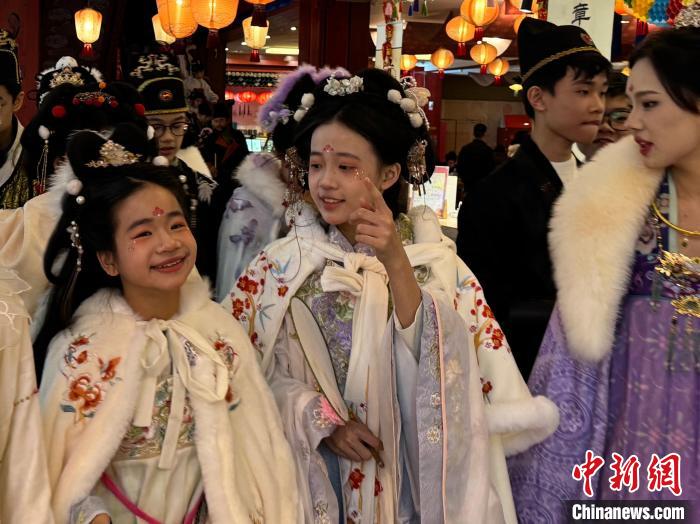 2024年“少年长安行—中外青少年共聚长安文化交流”活动近日在陕西西安举行。 22日,青少年们“入乡随俗”换上汉服,走进唐风市井街区,与“白居易”互动、享受传统美食、学习唐朝礼仪,在市井之中品味着唐朝风韵。图为马来西亚青少年身着汉服合影留念。