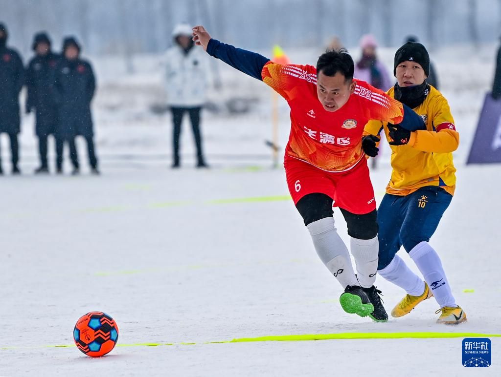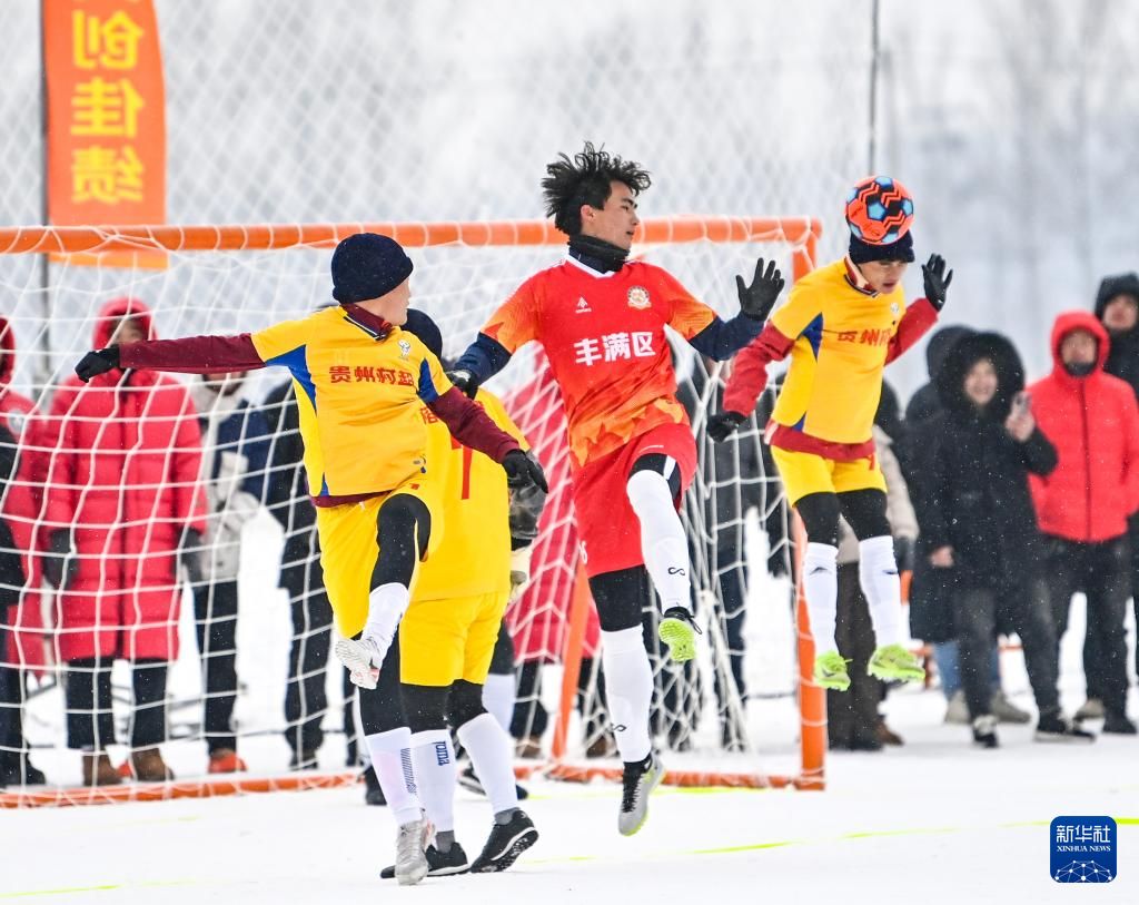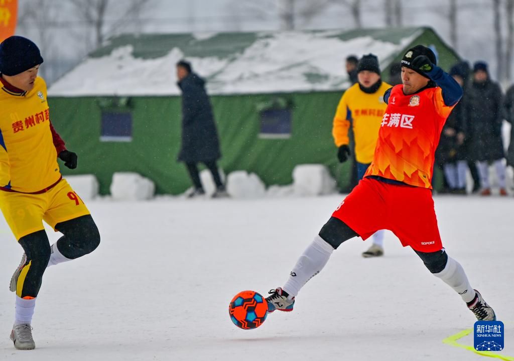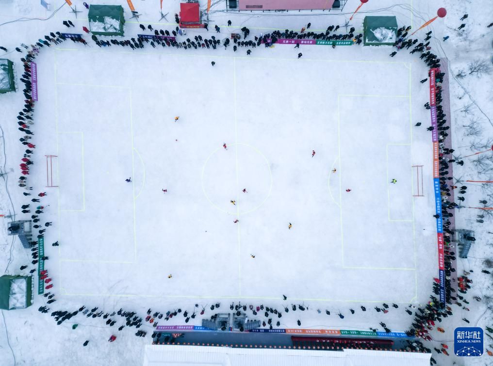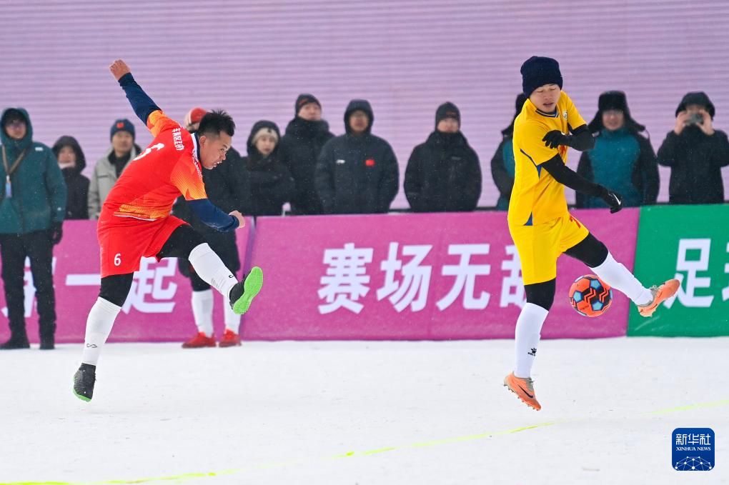 12月23日拍摄的南北乡村雪地足球邀请赛比赛现场(无人机拍摄)。